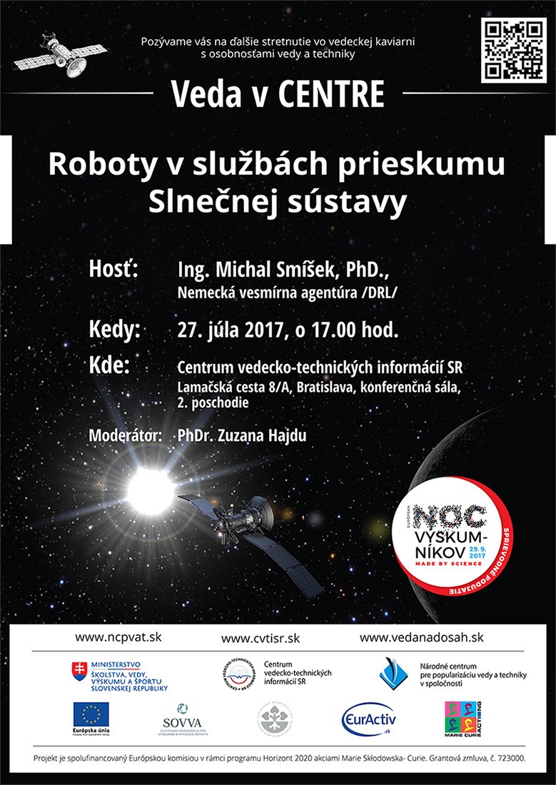 Podujatie sa uskutoční už tento štvrtok, teda 27. júla 2017 o 17.00 hod. v Centre vedecko-technických informácií SR na Lamačskej ceste 8/A, konkrétne v konferenčnej miestnosti na 2. poschodí. „Naším hosťom bude úspešný mladý slovenský vedec, matematik a robotik, Ing. Michal Smíšek, PhD., z Nemeckej vesmírnej agentúry (DLR). Oblasťou jeho vedeckého záujmu je vývoj robotických systémov pre prieskum planetárnych povrchov a iných človeku ťažko dostupných lokalít, ako dno oceánov a planetárny povrch,“ napísali do pozvánky organizátori.