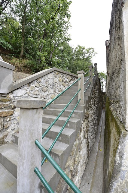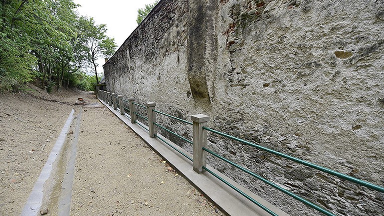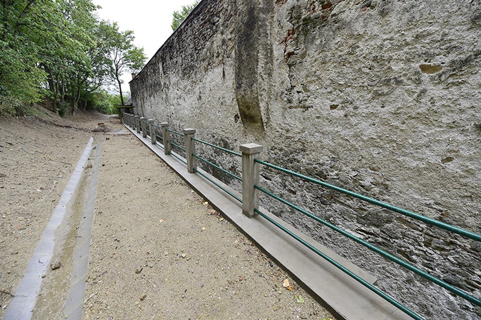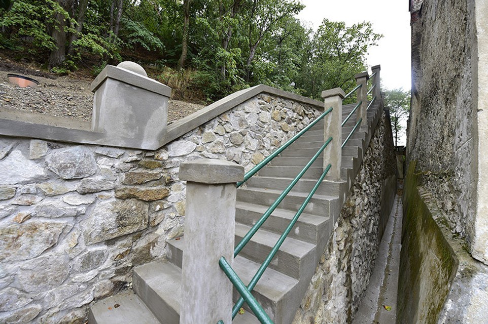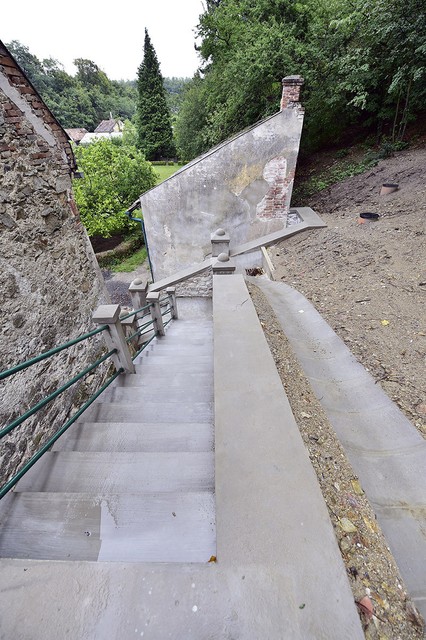 Prvým krokom bola oprava oporného múru v areáli záhrady Kaštieľa, ktorý bol ohrozovaný najmä zosuvom pôdy a koreňovým systémom stromov. Vzhľadom na kultúrnu hodnotu a pamiatkovú zónu, ostal zachovaný pôvodný tvar aj rozmery stáročného schodiska.