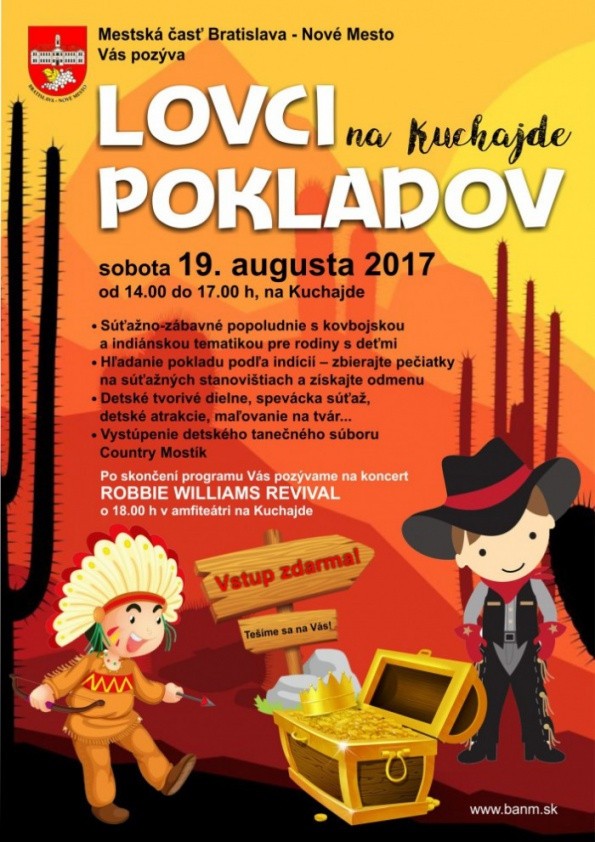 V rámci programu je naplánované aj vystúpenie detského country tanečného súboru Country Mostík a po skončení podujatia sa uskutoční ešte aj koncert Robbie Williams Revival – od 18.00 h v amfiteátri na Kuchajde. Vstup na Lovcov pokladov je zdarma.