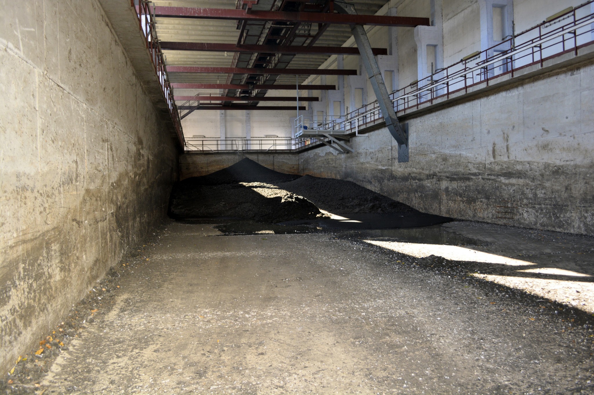 9. Odvodnený kal sa uskladňuje v nádrži. Zmestí sa sem ročná produkcia kalu, asi 6000 ton. Kal vyzerá ako zem a sčasti tak aj vonia.