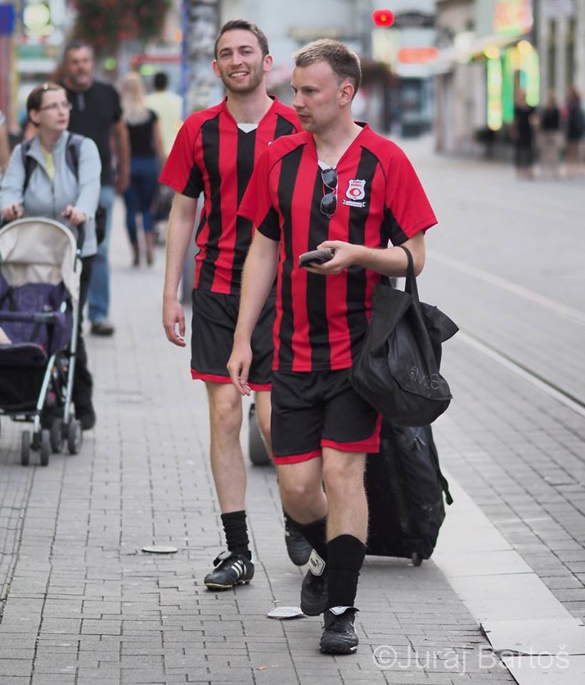 Mladí muži si boli asi hrať futbal a nechcelo sa sa im prezliekať...