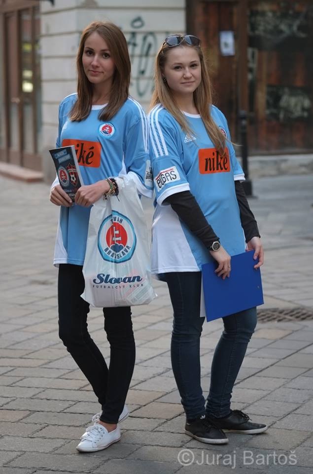 Tieto hostesky v dresoch futbalového Slovana pozývali ľudí na derby so Spartakom Trnava...