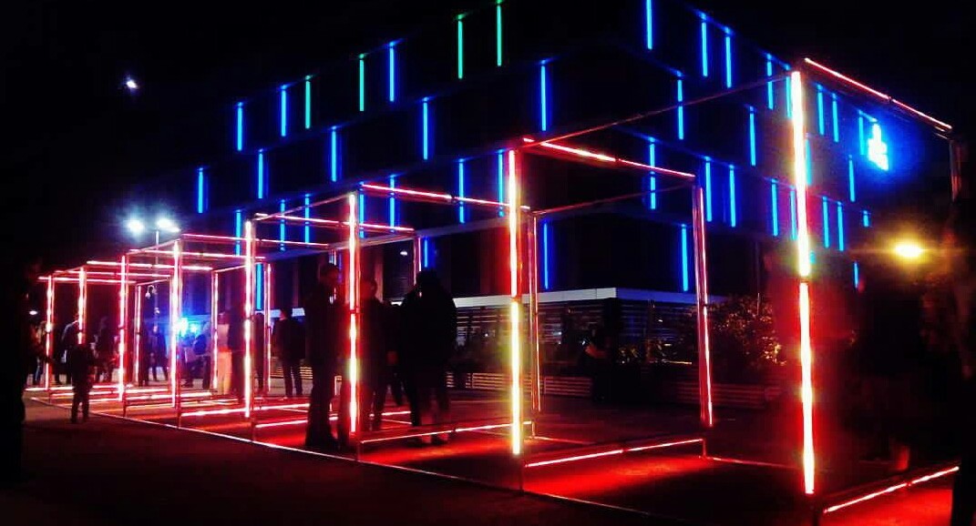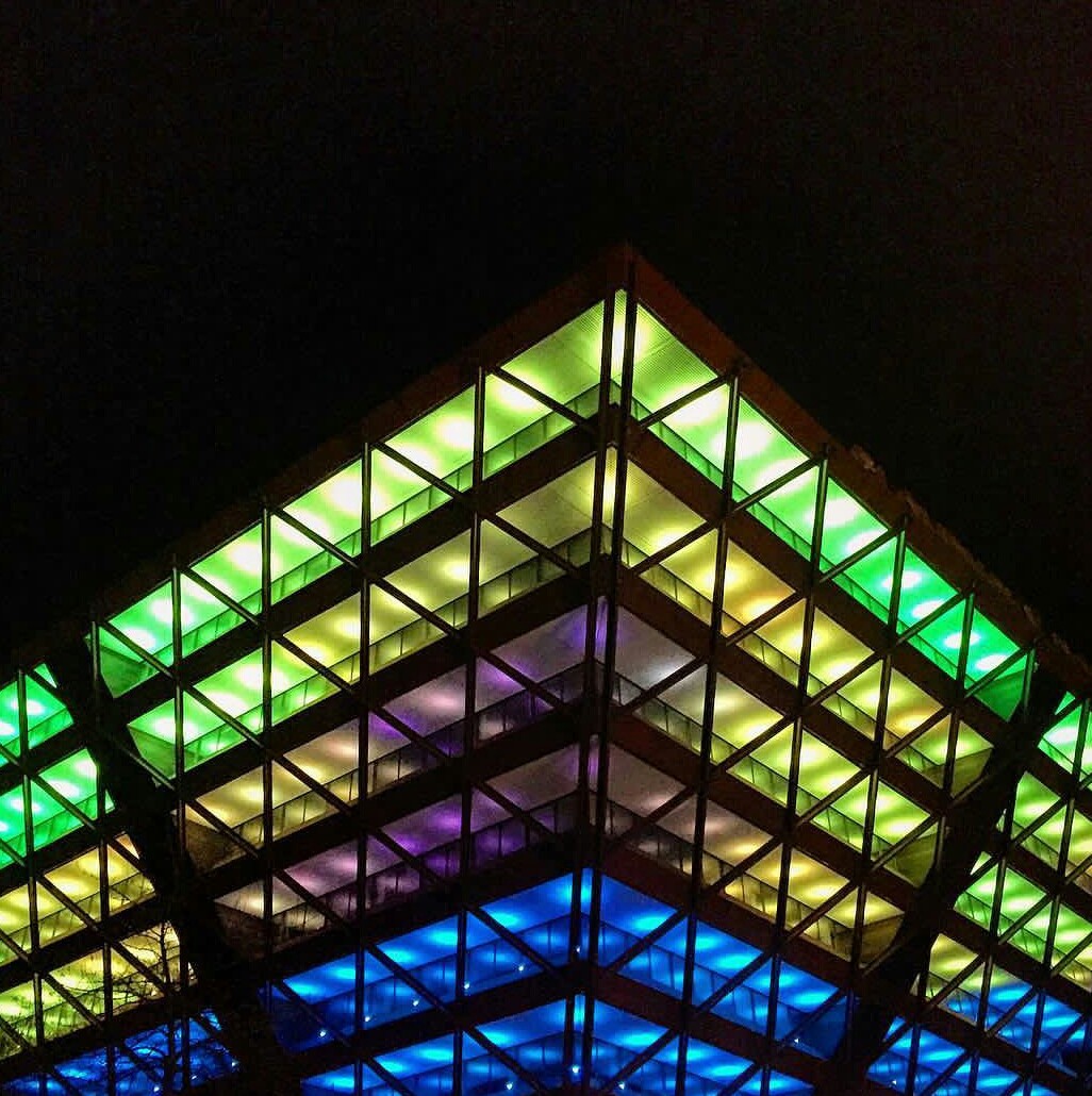 Slávna rozhlasová pyramída žiarila počas noci rôznymi farbami.
