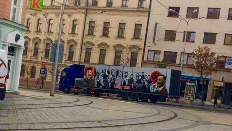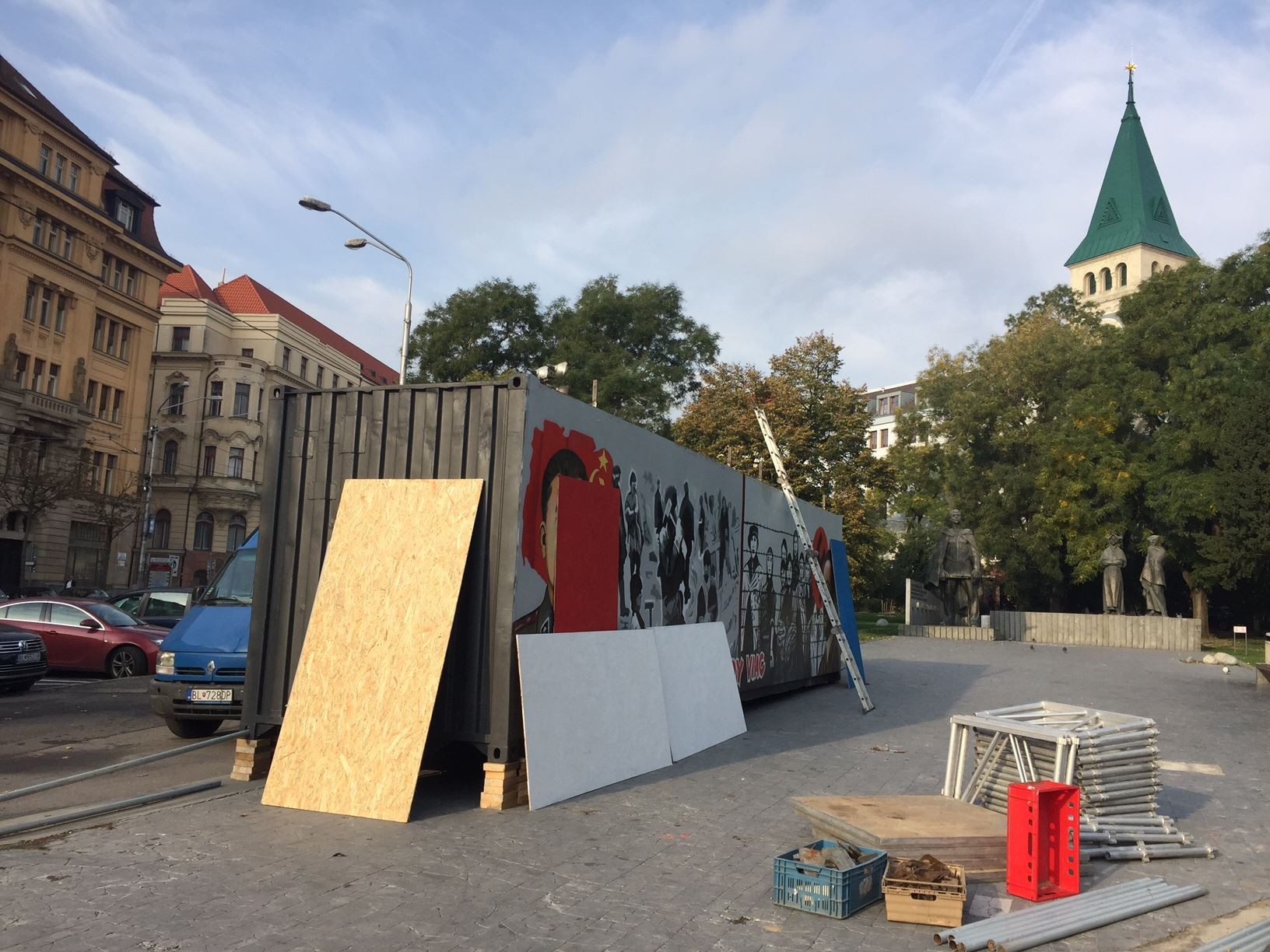 Na Námestí SNP pristavili obrovský kontajner s obrazmi Hitlera a Stalina – o čo ide?