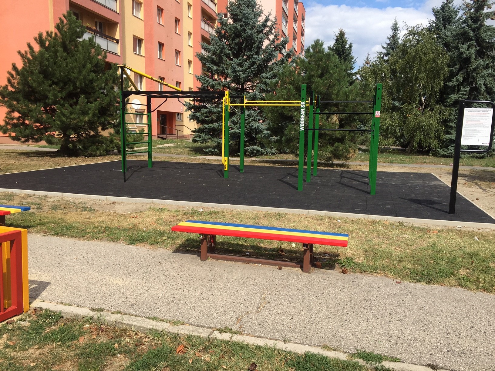Prvá zostava (na hornej fotografii) je umiestnená v sídliskovom vnútrobloku na ulici Československých parašutistov. Pozostáva zo zvislých a vodorovných rebrín, dance tyče, trojitých paralelných bradiel a jednoduchých hrázd. Druhá zostava (na spodnej fotografii) sa nachádza na Nobelovej ulici v blízkosti detského ihriska a pozostáva zo zvislých a vodorovných rebrín, dance tyče, vertikálneho bradla a jednoduchých hrázd. Každá jedna zostava je vybavená bezpečnostnou dopadovou plochou z gumených rohoží a informačnou tabuľou s pokynmi na jej používanie.