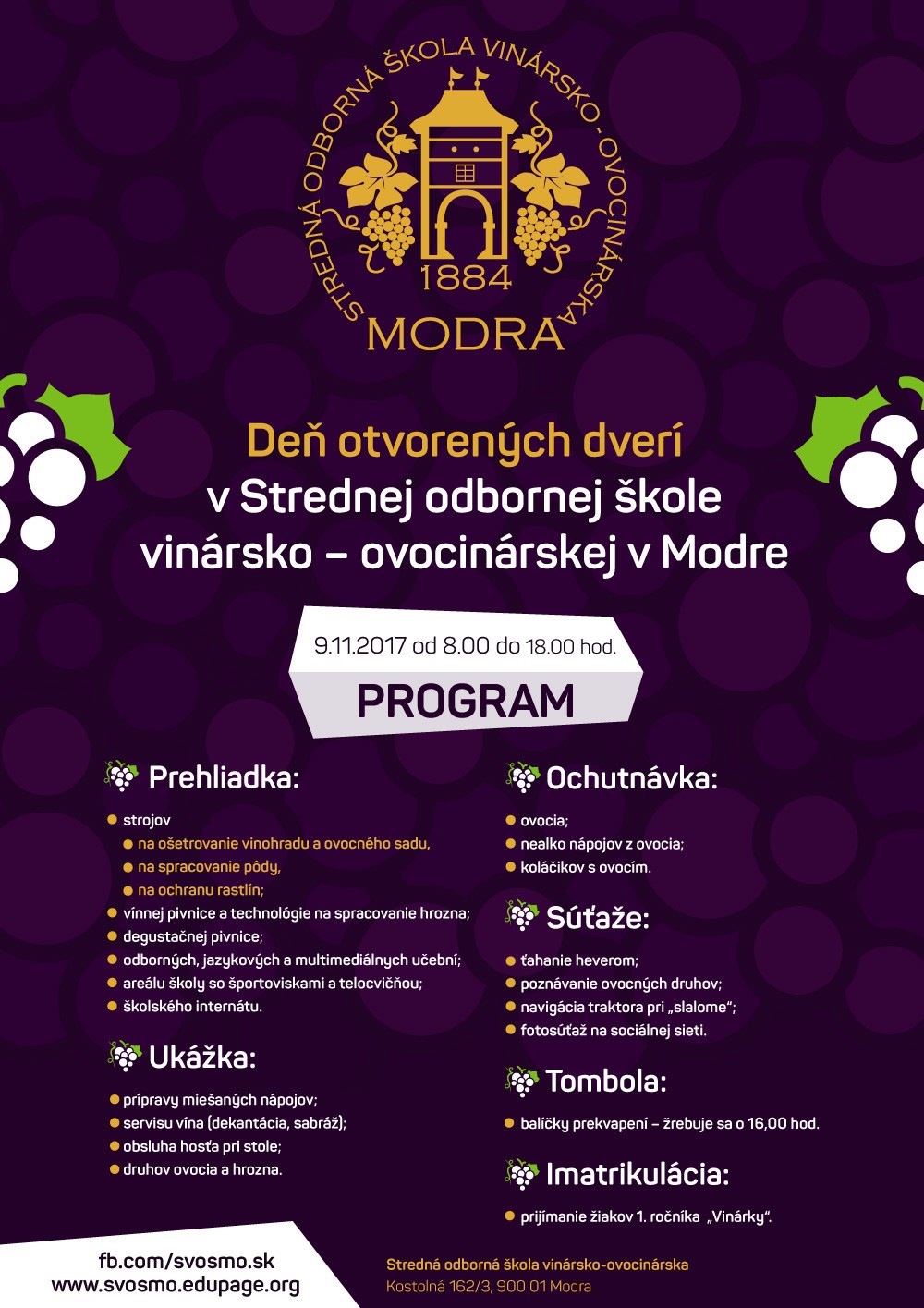 Stredná odborná škola vinársko – ovocinárska v Modre, ktorá je jediná svojho druhu na Slovensku, pozýva na Deň otvorených dverí zajtra už od ôsmej hodiny rána. Každý tak bude môcť spoznať školskú vínnu pivnicu a technológie na spracovanie hrozna, odborné učebne ale zoznámiť sa žiaci budú môcť aj so strojmi na ošetrovanie vinohradu či ovocných sadov. Súčasťou prehliadky bude aj degustácia muštov a nealko výrobkov z hrozna.