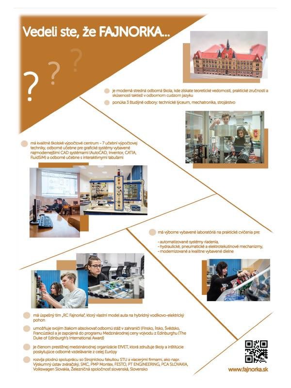 Na Deň otvorených dverí pozýva aj Stredná priemyselná škola strojnícka na Fajnorovom nábreží v Bratislave. „Fajnorka“ bude svoje úspechy a študijné odbory prezentovať od 10:00 do 16:00. Prvý školský rok sa na priemyslovke začal v roku 1903 a koncom tohto roka sa začala stavať aj samotná budova na Fajnorovom nábreží, kam sa hneď po dostavbe priemyslovka nasťahovala. Momentálne ponúka „Fajnorka“ tri študijné odbory denného štvorročného štúdia a to mechatronika, strojárstvo a technické lýceum.