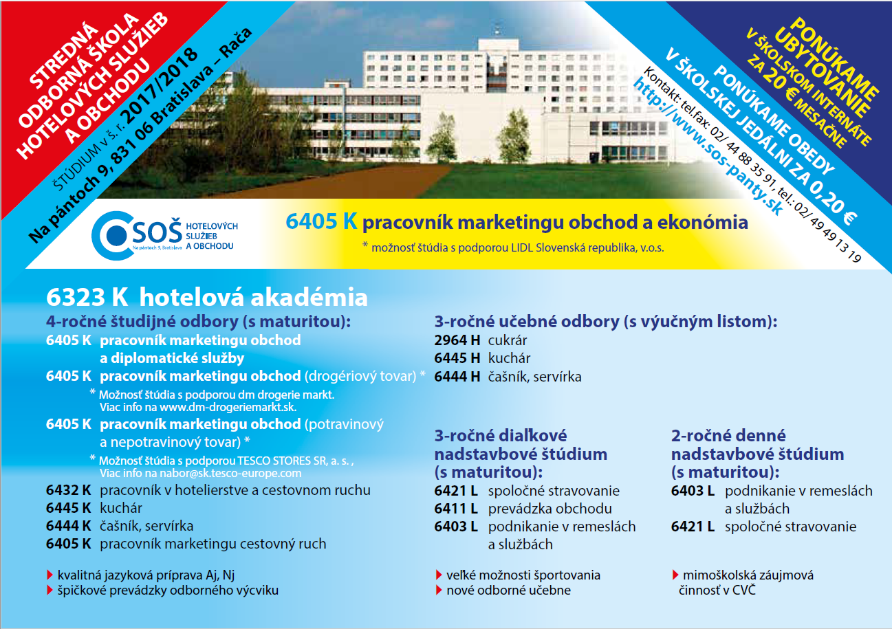 Dni otvorených dverí sa od začiatku novembra 2017 začali aj na Strednej odbornej škole hotelových služieb a obchodu Na pántoch 9. Škola je pre záujemcov otvorená denne od 9:00 do 14:00 a stačí sa nahlásiť na telefónnom čísle 02 4488 35 91. SOŠ hotelových služieb a obchodu Na pántoch ponúka žiakom 5-ročné štúdium v odbore hotelová akadémia, 4-ročné študijné odbory s maturitou a výučným listom sú v odbore pracovník marketingu (so zameraním na obchod a diplomatické služby), pracovník v hoteliérstve a cestovnom ruchu, čašník a servírka a maturitou sa končí aj odbor kuchár. Na kuchára, cukrára a na čašníka sa však môžu študenti vyučiť aj v trojročnom odbore, ktorý ukončia výučným listom.