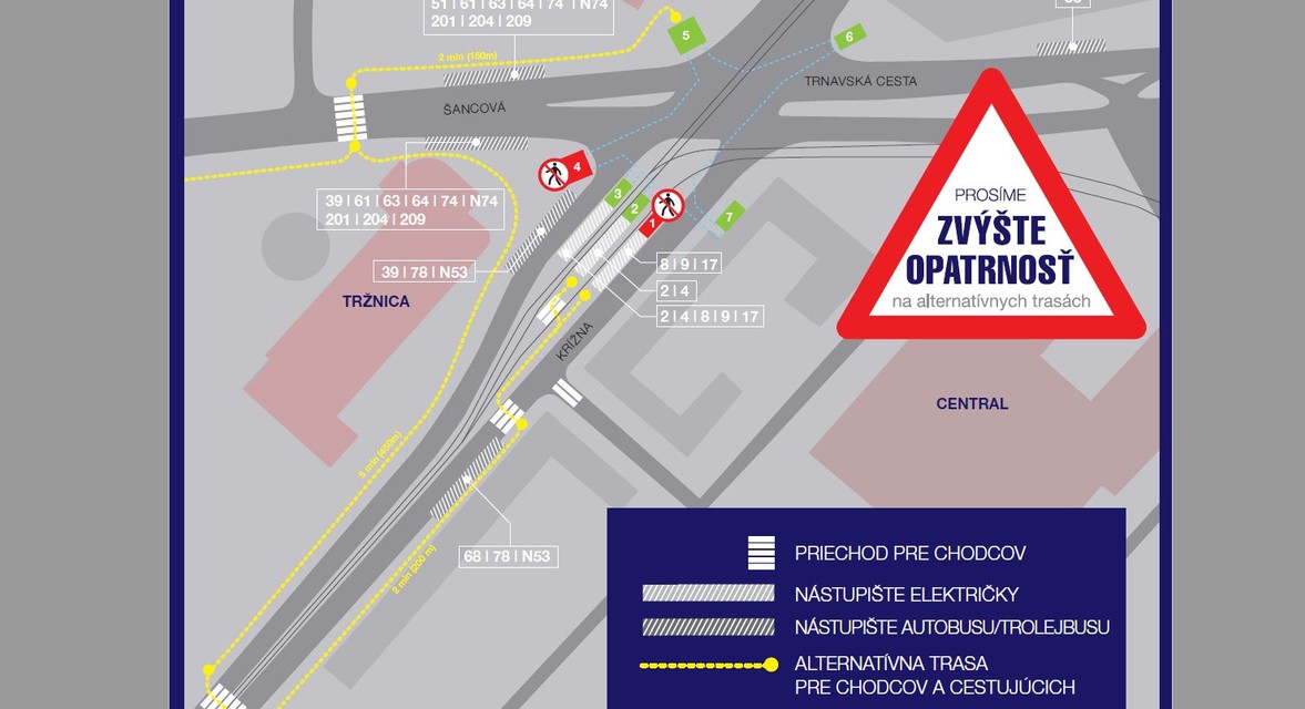 - Vstup do podchodu Nová tržnica bude uzatvorený - obchádzková trasa bude viesť po Šancovej ulici k priechodu pre chodcov pri Novej tržnici v smere na Kukučínovu ulicu. Následne bude potrebné prejsť na druhú stranu a po chodníku až ku vstupu do podchodu Istropolis