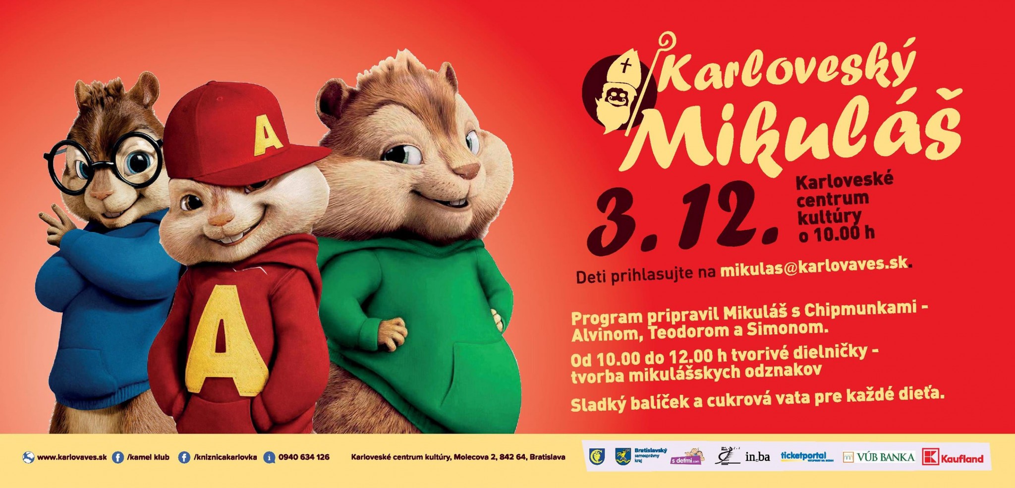 Mikulášsky program v Karloveskom centre kultúry tentokrát obohatia známi Chipmunkovskí kamaráti Alvin, Teodor a Simon. Zažijete s nimi neopakovateľnú talent show, pri ktorej sa zabavia deti i dospelí. Mikuláš na rozprávkových saniach bude mať pripravené pre každé dieťa sladký balíček a cukrovú vatu. V čase od 10.00 do 12.00 h bude prebiehať tvorivá dielnička, kde si deti vyrobia vlastný mikulášsky odznak.