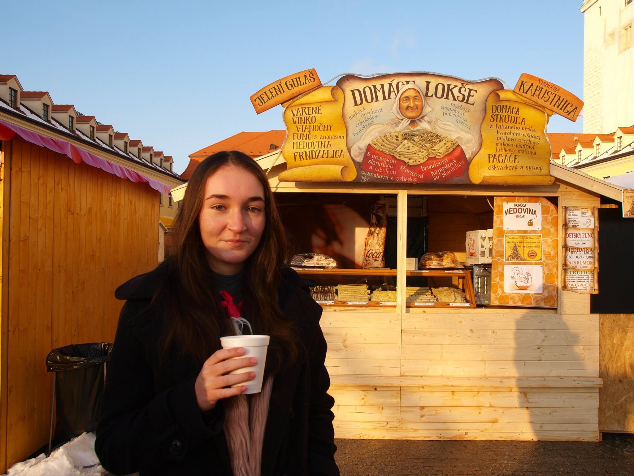 Mladá návštevníčka vianočných trhov na hrade ochutnáva jeden z horúcich nápojov.
