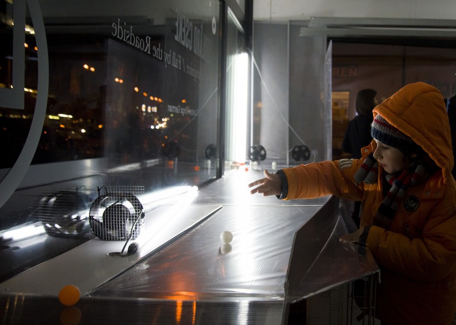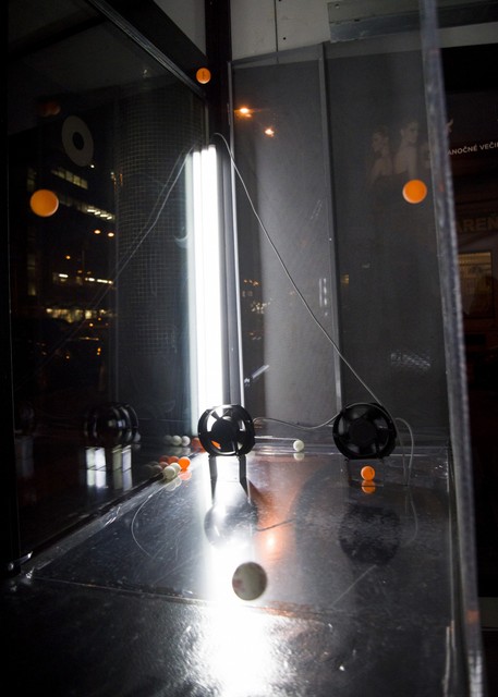 Na trase plnej nástrah hrozí loptičkám neustále vytýčenie z trajektórie. Dôležitou súčasťou inštalácie sa v tej chvíli stávajú návštevníci galérie. „Keď jedna alebo viacero loptičiek vypadnú z pomyselného systému, v ktorom rotujú na báze ventilátorov, tak ju môžete zdvihnúť, niečo na ňu napísať, zanechať osobný odkaz a zapojiť ju zase do systému. Je tam veľmi silná ľudská metafora, ktorá umne zapája diváka do hry,“ povedala Nina Vrbanová, poverená riaditeľka KHB a hlavná kurátorka.