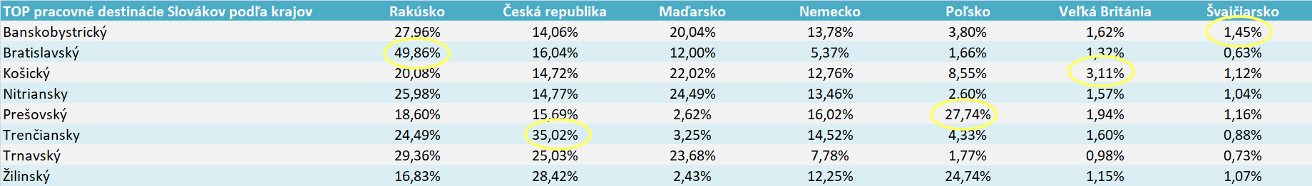 Ako sa hovorí, každý sme z iného cesta a iného kraja, tak sa pozrime ako sa líšia naše zahraničné pracovné preferencie, podľa toho, v ktorom kraji bývame. Až polovica obyvateľov Bratislavského kraja cestuje za prácou do susedného Rakúska a do prehľadu spoločnosť Market Locator pridala aj ďalšie dve zaujímavé krajiny pre našich zahraničných pracujúcich. Práve Veľká Británia je obľúbená pre pracujúcich z košického kraja a do Švajčiarska vycestovali za prácou najviac z Banskobystrického kraja.