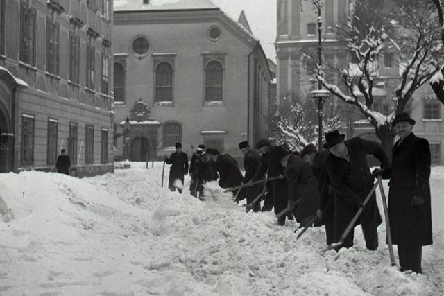 Bratislavčania odhadzujú sneh počas zimy v roku 1947.