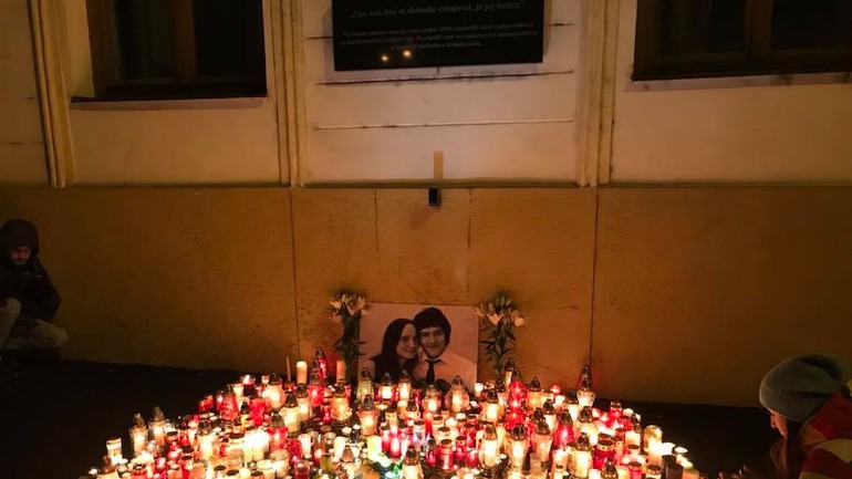 Ľudia zapaľujú sviečky na improvizovanom pietnom mieste v centre Bratislavy.Úkladná vražda investigatívneho novinára Jána Kuciaka a jeho snúbenice Martiny Kušnírovej, ktorá sa odohrala v predošlých dňoch vo Veľkej Mači (okr. Galanta), otriasla včera celým Slovenskom. Verejnosť v Bratislave v pondelok večer skutočne vyšla do ulíc, aby vyjadrila sústrasť pozostalým a spoluúčasť na ich smútku z nezmyselnej smrti dvoch mladých a nevinných ľudí.