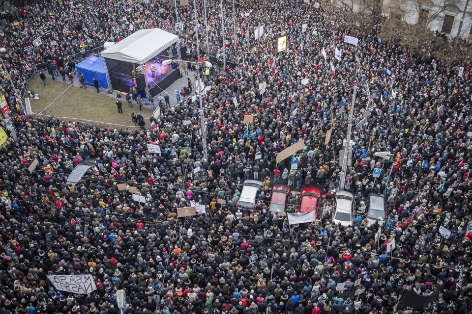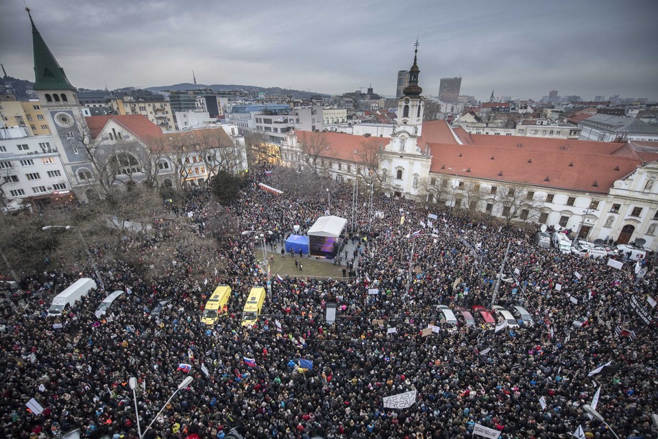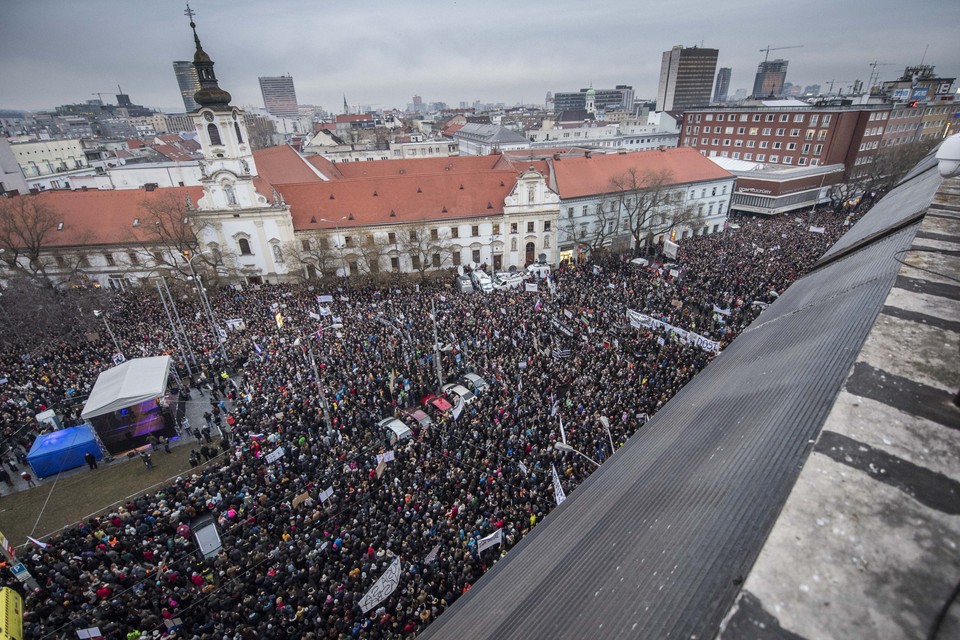 Bratislavské Námestie SNP, na ktorom sa tradične lámu dejiny novodobého Slovenska, dnes praskalo vo švíkoch. Také plné bolo naposledy v časoch Nežnej revolúcie.