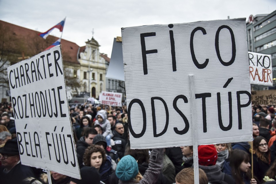 Dav, ktorý zaplnil celé námestie, štrngal kľúčmi a opakovane skandoval heslo „Dosť bolo Fica“. Transparenty boli namierené proti súčasnej vláde, odsudzovali korupciu, žiadali vyšetrenie káuz a potrestanie vinníkov.
