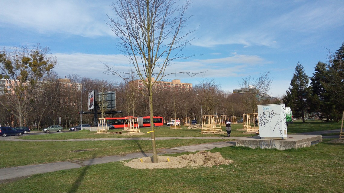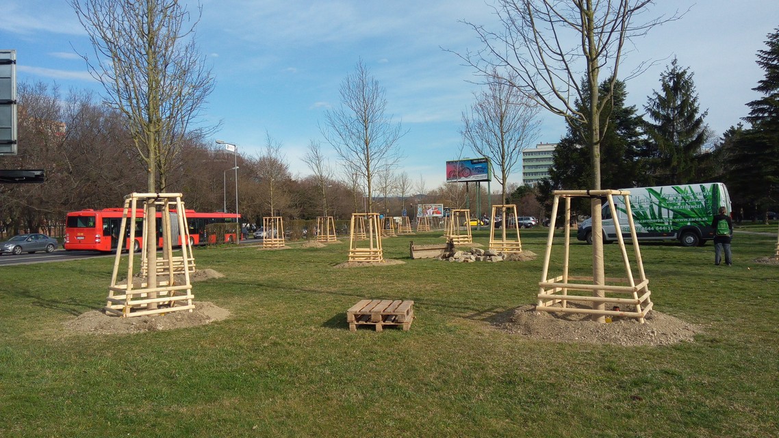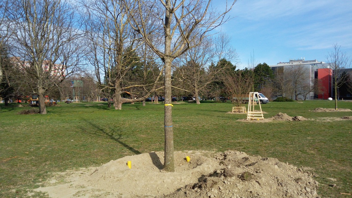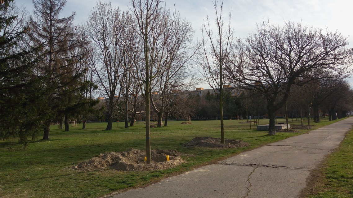 Boli sme sa presvedčiť, ako práce na budovaní parku napredujú. Stromy, ktorými sa práce začali, sú už vysadené, včera čakali na posledné dva. „Práve sme museli jeden strom oproti pôvodnému projektu posunúť kvôli podzemnému potrubiu,“ prezradila nám záhradná architektka Zuzana Rusková, ktorá priamo na mieste výsadbu drevín koordinovuje. Ide o vzrastlé stromy, takže vzhľad miesta sa mení prakticky okamžite. Ako ďalej záhradná architektka vysvetlila, na niekoho môže v tejto fáze rozmiestnenie stromov pôsobiť zvláštne. Je to tak preto, že sa ráta s vybudovaním jazierka a ďalších prvkov, ktoré celkový charakter parku dotvoria. Okrem jedlých druhov v ňom pribudnú aj brezy, duby, lipy, javory, mandle, ginká, liesky či jarabiny, z pôvodných stromov na mieste nevyrúbu ani jeden.