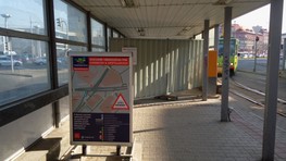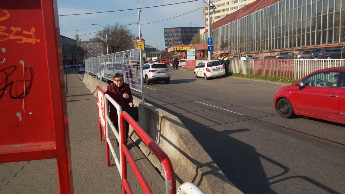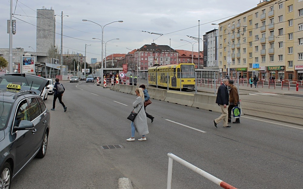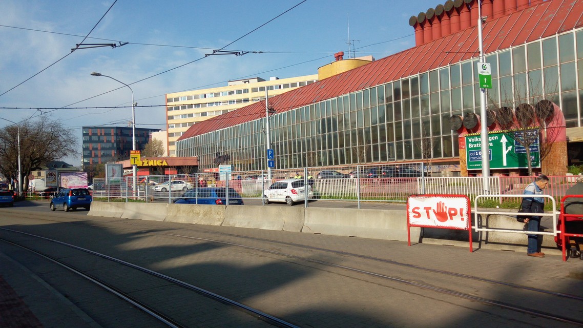 Na mieste, kde doteraz chodci hromadne prechádzali cez vozovku, teda od električkových zastávok k budove tržnice, osadili betónové zábrany s pletivom. Ani to však chodcov neodradilo. Medzi zábranou a železným zábradlím je totiž akurát priestor, cez ktorý prejde jeden človek. A tak ľudia prechádzajú cez cestu naďalej a to aj priamo pred zrakmi mestských policajtov, ktorí tam stoja rovnako ako počas predchádzajúcich dní. Mnohí, najmä starší ľudia, ale nemajú veľmi na výber. Museli by prejsť najskôr cez koľajnice, potom šliapať do pdochodu dolu schodmi (eskalátory tu už nie sú) a následne sa dostať opäť pešo hore, čo je pre mnohých namáhavé. Nám sa dokonca podarilo nakrútiť, ako bežiaca pani pri vychádzaní na cestu spadla a dokonca zhodlia dopravné značenie. Našťastie sa jej nič vážne nestalo.