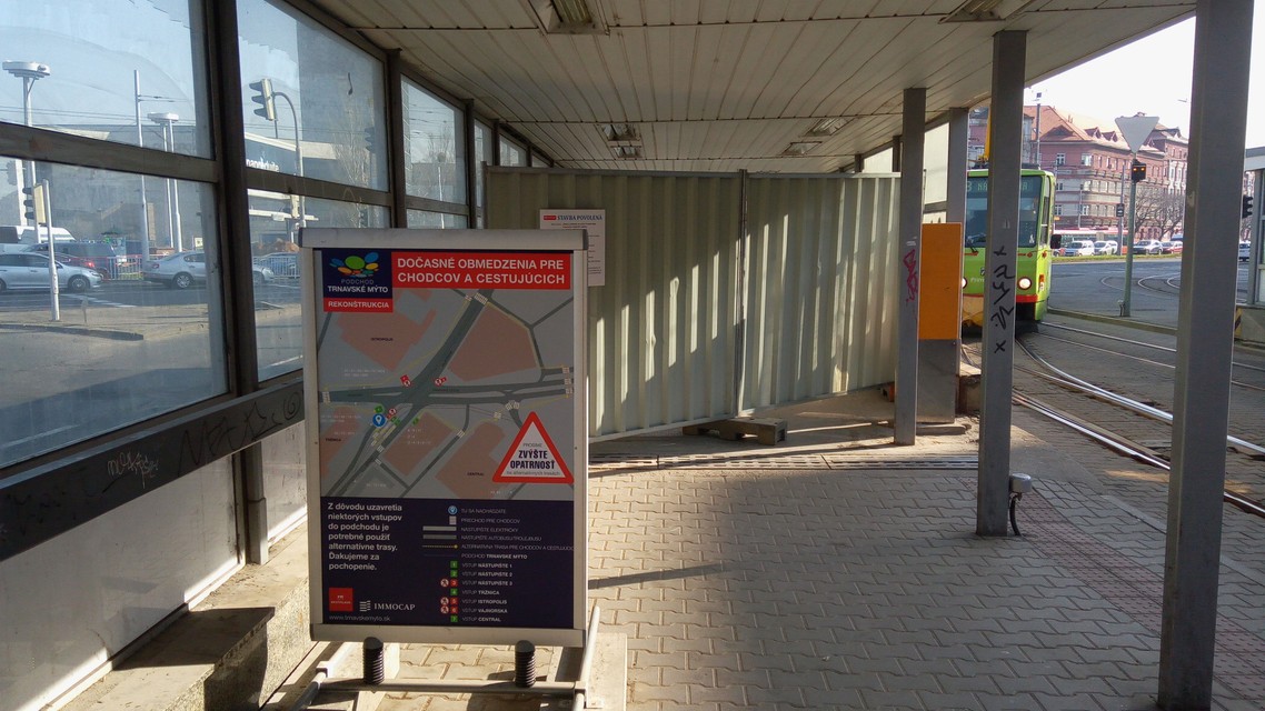 Chodci sa musia vysporiadať aj s novovzniknutou situáciou, pokiaľ ide o uzatvorené vstupy do podchodu. Ten je momentálne využiteľný iba na prechod po zúženej chodbe smerom od tržnice po východ na Central (otvorené sú aj vstupy na električkové zastávky smer Zlaté piesky a Ružinov). Vstup do podchodu na električkovej zastávke smerom do mesta je uzavretý. Rovnako je uzavretý aj vstup pri Dome odborov a vstup v smere od zimného štadióna. O nových obchádzkových trasách pre chodcov sme písali TU.
