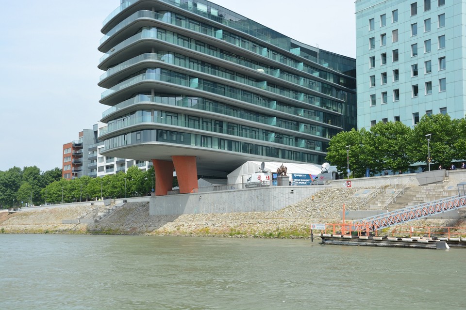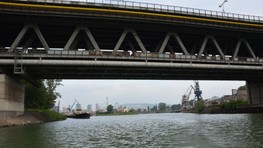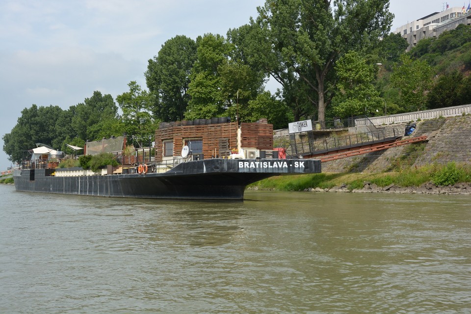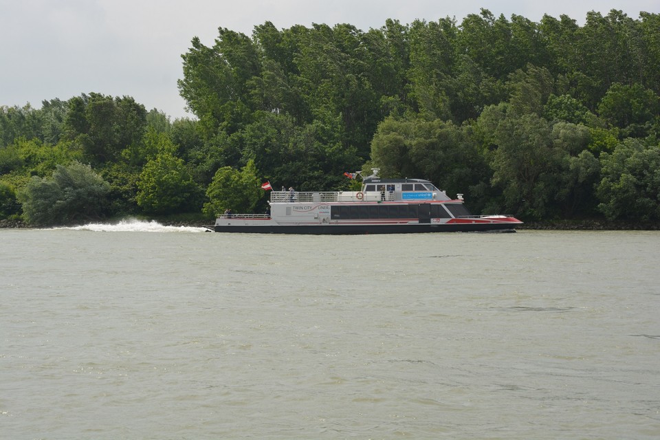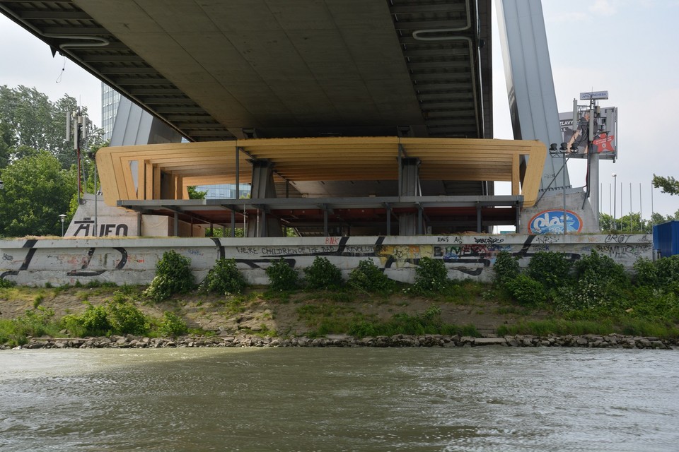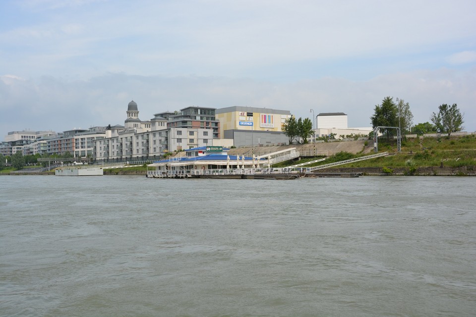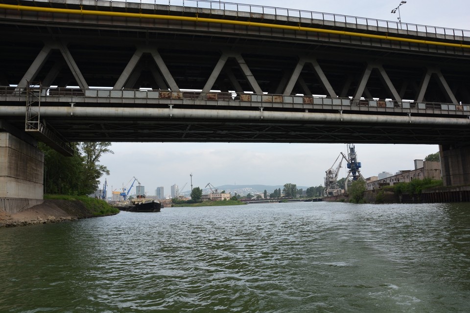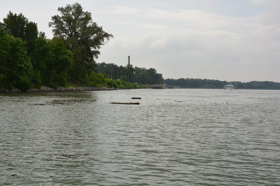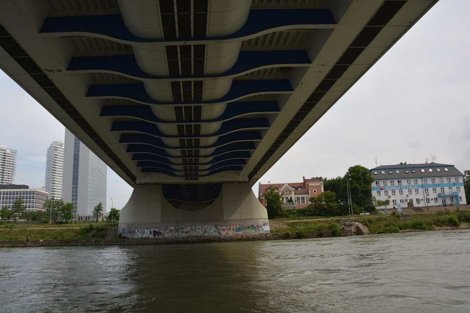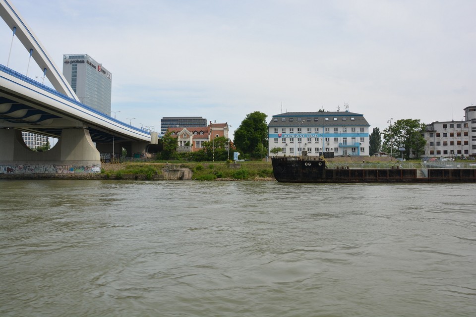 Pri výjazde z bazénu nás posádka lode upozorňuje na naplaveniny, ktoré sú tu nahromadené. Ide najmä o odlomené konáre stromov, ale zazreli sme vo vode aj nejaké prázdne fľašky. Vytlačil ich sem prúd rieky. Naše plavidlo je vybavené asi ako každá poriadna loď aj sonarom, ktorý monitoruje dno rieky. „Teraz sa poriadne držte,“ upozorňuje nás kapitán, ktorý loď otáča proti prúdu a zapína motor na vyšší výkon. Plavíme sa od Prístavného mosta smerom k Mostu Apollo. Pontóny na petržalskej strane rieky sú pomaľované grafitmi a to aj ten, čo stojí vo vode. Asi bola vtedy nižšia hladina vody. „Dnes má Dunaj štyri metre,“ dozvedáme sa od posádky zároveň s informáciou o plavebných dráhach, ktoré sú nakreslené na mapke skôr bližšie k petržalskému brehu. Medzitým míňame v pomerne veľkej rýchlosti Euroveu a stretávame osobnú loď, ktorej osadenstvo nás zdraví hlasnými výkrikmi: „Ahoj!“ a veselým mávaním.