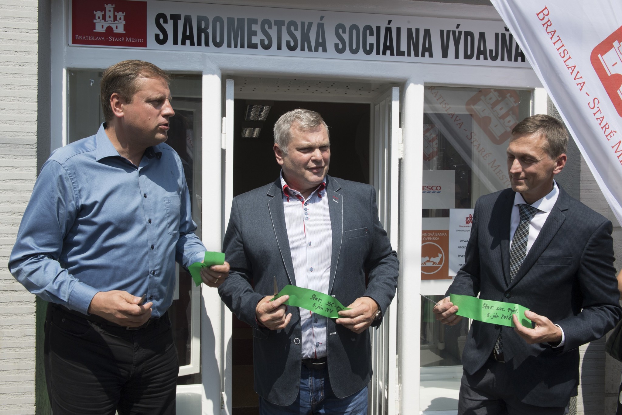 Starosta Radoslav Števčík, predseda Potravinovej banky Marko Urdzik a výkonný riaditeľ Tesco na Slovensku Martin Kuruc: