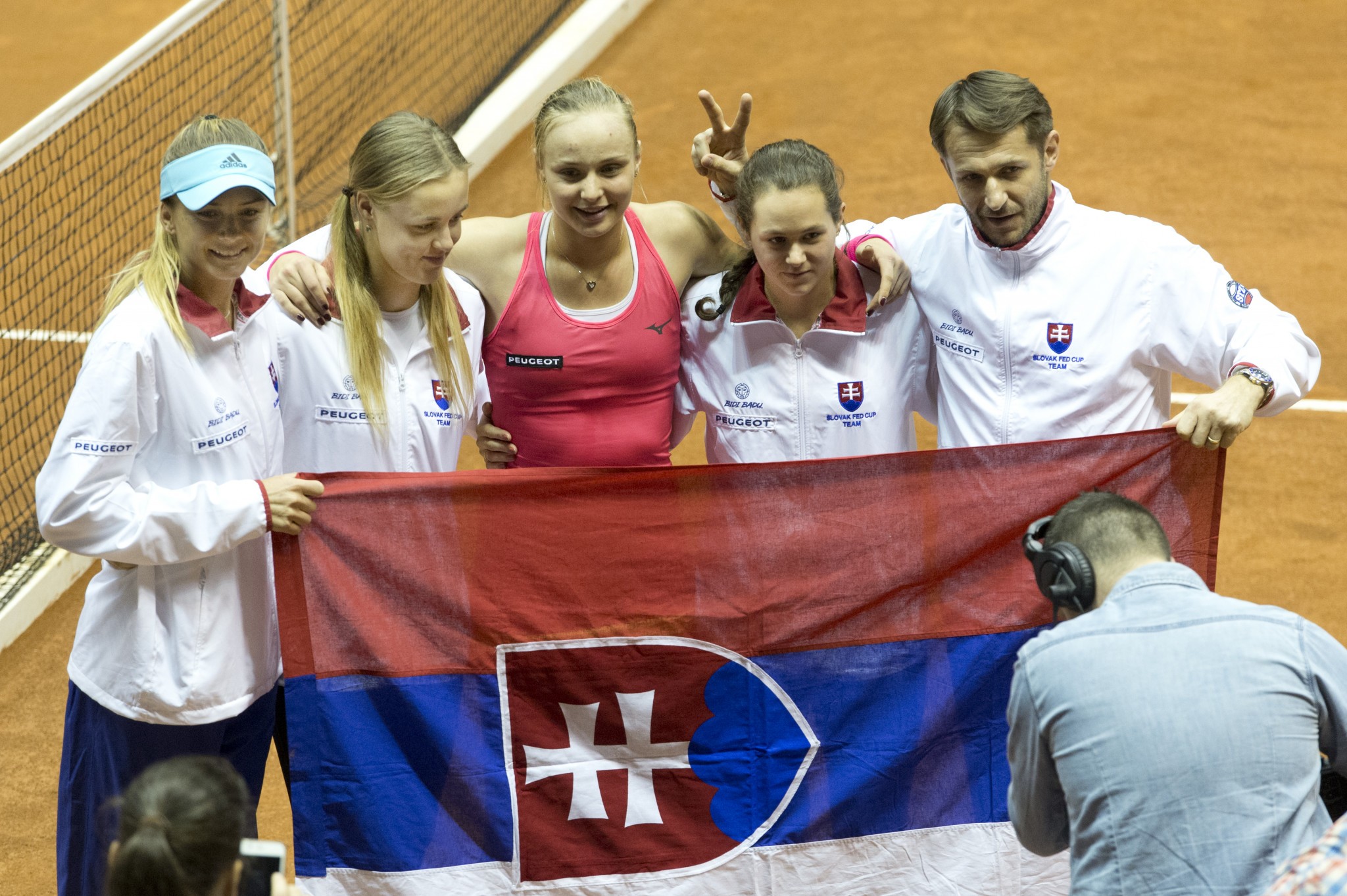 Daniela Hantuchová, Anna Karolina Schmiedlová, Rebecca Šramková, Jana Čepelová a tréner Matej Lipták po slávnom víťazstve Sloveniek nad Taliankami vo Fed Cupe 2017.