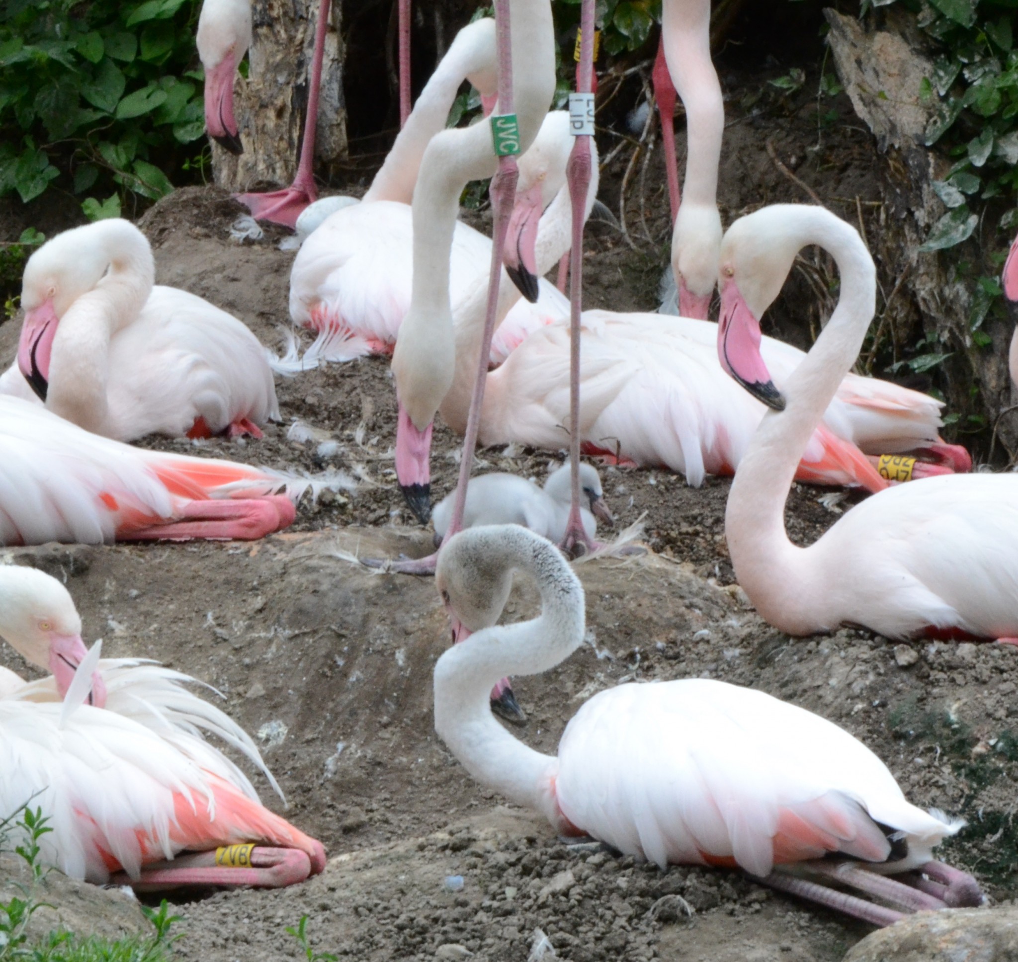 V júni prišli na svet v ZOO i plameniaky ružové. "Plameniaky sú párové zvieratá, no žijú a hniezdia v mnohopočetných kolóniách. Samica znáša len jedno vajíčko do hniezda, ktoré má podobu kopčeka s jamkou. Vo veľkých skupinách je nutné, aby sa matka a jej mláďa navzájom rozpoznali. Niekoľko hodín pred vyliahnutím si matka a jej potomok začnú vymieňať zvuky – volania. Tento úkaz sa nazýva „vpečatenie“. Rodičia kŕmia svoje mláďatá vysoko výživnou zmesou, nazývanou „mlieko“ ktorá je zložená z tukov, proteínov, karbohydrátov a krvi. Hniezda si páry stavajú v tzv. krčných vzdialenostiach, aby na hniezdiacu dvojicu nedočiahla susedná dvojica. Plameniaky si totiž svoje hniezda bránia pred ostatnými členmi kolónie," vysvetlila Ritterová. Plameniaky sú schopné udržiavať polovicu tela v stave odpočinku a druhú v stave bdeniaa vážia iba od dvoch do štyroch kilogramov. Ich domovinou sú juh Európy, pobrežie Afriky, Madagaskar, Malá Ázia a India.