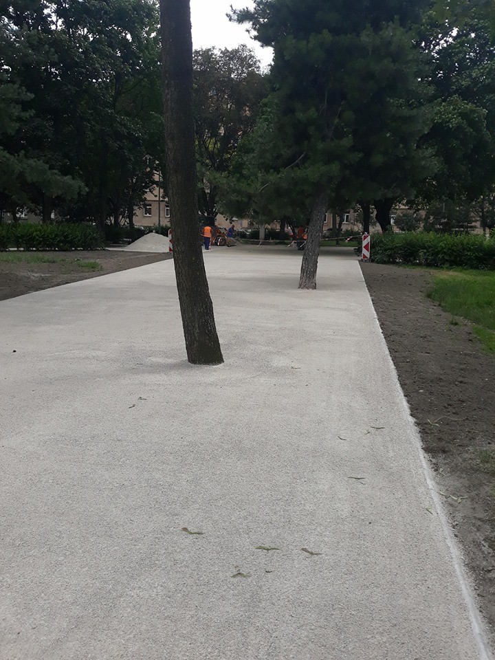 Boli sme sa v parku na Kmeťovom námestí, ktorý sa nachádza v blízkosti študentského domova Juraja Hronca prezývanom aj Bernolák, pozrieť na vlastné oči a v skutočnosti okolo stromov nie je betón ani asfalt, ale vápencová drť, ktorá je dostatočne tvrdá, aby sa po nej dalo chodiť, ale zároveň vodu prepúšťa pod povrch. Takéto mlatové chodníky sú vo svete pomerne bežné a často sa používajú najmä v mestských parkoch. Ich výhodou je aj to, že si udržia potrebnú vlhkosť, takže sa parky potom neprehrievajú, čo by sa asi dialo, ak by tam boli betónové respektíve asfaltové plochy.