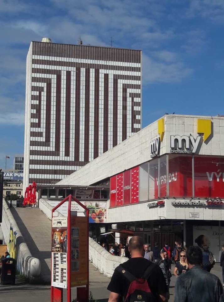 "Fasáda hotela Kyjev sa zmení len dočasne. Naša spoločnosť je jedným z partnerov podujatia Bratislava Street Art Festival 2018, ktorý vyvrcholí 30. júna. A preto sme jednému z umelcov umožnili, aby na jednej zo stien výškovej budovy vytvoril výtvarné dielo," povedal pre Bratislavské noviny Peter Borko, ktorý mediálne zastupuje súčasného vlastníka hotela Kyjev - firmu Lordship. Tá už predložila verejnosti niekoľko vizualizácií ako by mal hotel Kyjev a jeho bezprostredné okolie v budúcnosti vyzerať, ale s rekonštrukčnými prácami sa má začať najskôr až budúci rok. V týchto dňoch sa teda na fasáde pracuje v súvislosti s vytvorením umeleckého diela. Od horných poschodí sa fasáda premaľúva a vzniká na nej nový farebný a geometrický vzor.