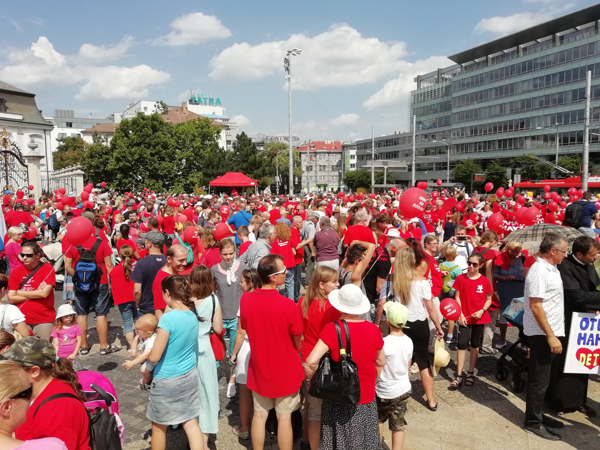 Dominovali mu červené tričká, ktoré mali účastníci na výzvu organizátorov poobliekané. Chromík (na úvodnej fotografii) bol s plným námestím mimoriadne spokojný ."Je tu možno aj 10-tisíc ľudí, s takou veľkou účasťou som ani nerátal " vyjadril sa pre bratislavskenoviny.sk.
