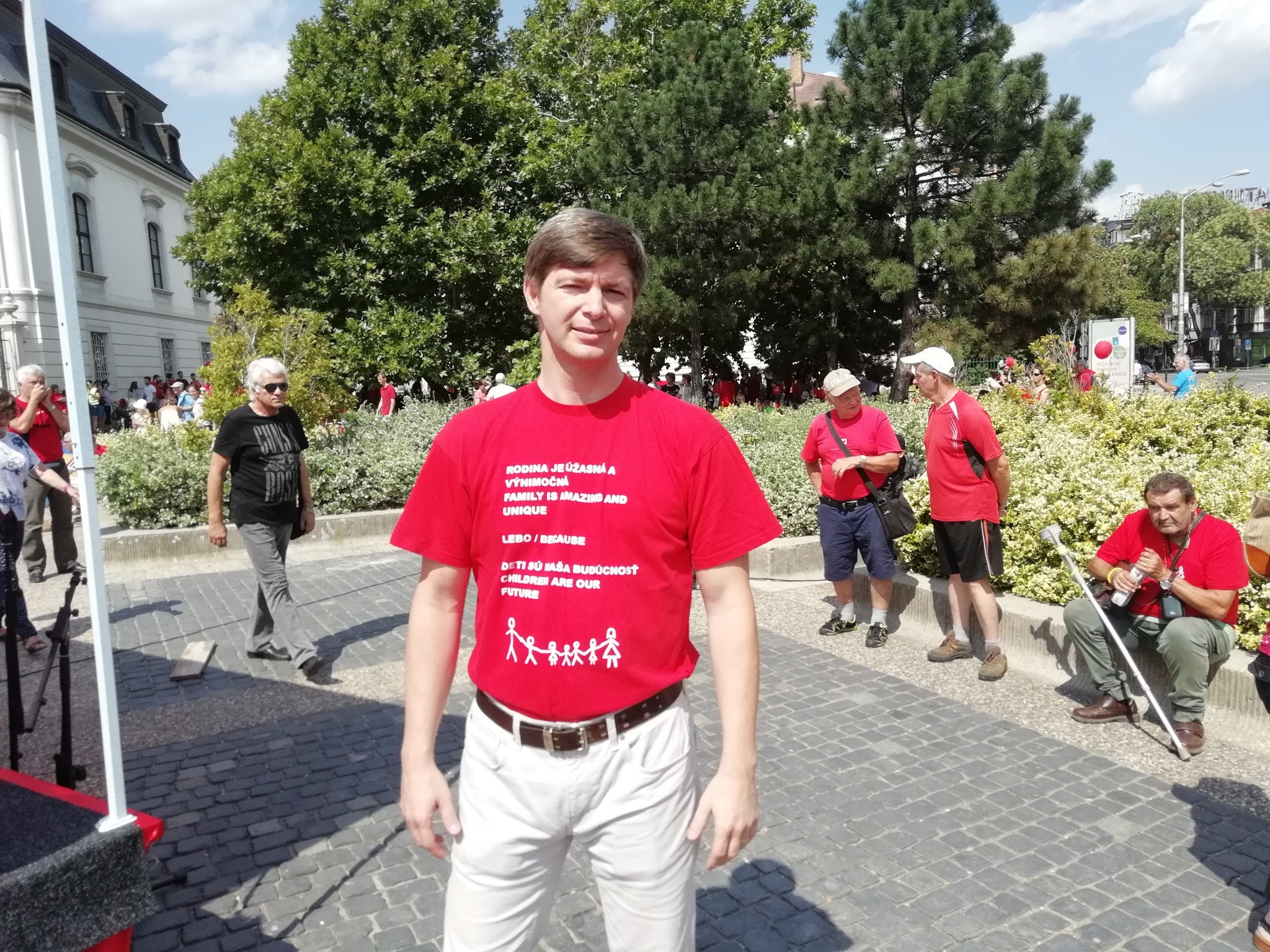 K pochodu LGBTI komunity Dúhový PRIDE začína pomaly v Bratislave pomaly neodmysliteľne patriť aj akcia iného tábora - kresťanských konzervatívcov. Rovnako tomu je i dnes, keď známi konzervatívni aktivisti Anton Chromík a Marek Nikolov zorganizovali svoju akciu Hrdí na rodinu.