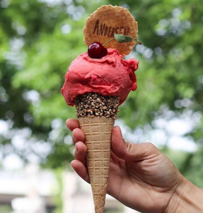 U Andersena ponúkajú lahodné príchute ako ricotta figa, čierny kokos či belgickú čokoládu. V chladiarenskom boxe na vás čakajú aj obľúbené bezmliečne vegánske sorbety, my sme si vybrali černicový. V kombinácii s vegánskou Čoko Nero, ktorá je bez pridaného cukru to bola naozaj trefa do čierneho. Každý deň majú v ponuke 20 príchutí a ponuku príchutí každý deň obmieňajú.