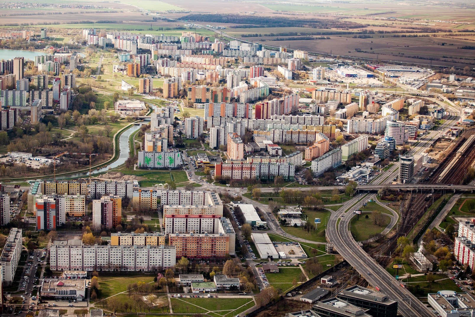 Petržalské Dvory, Lúky a Háje. Vpravo je Chorvátske rameno, vľavo Panónska cesta a medzi nimi pestrofarebné petržalské paneláky.