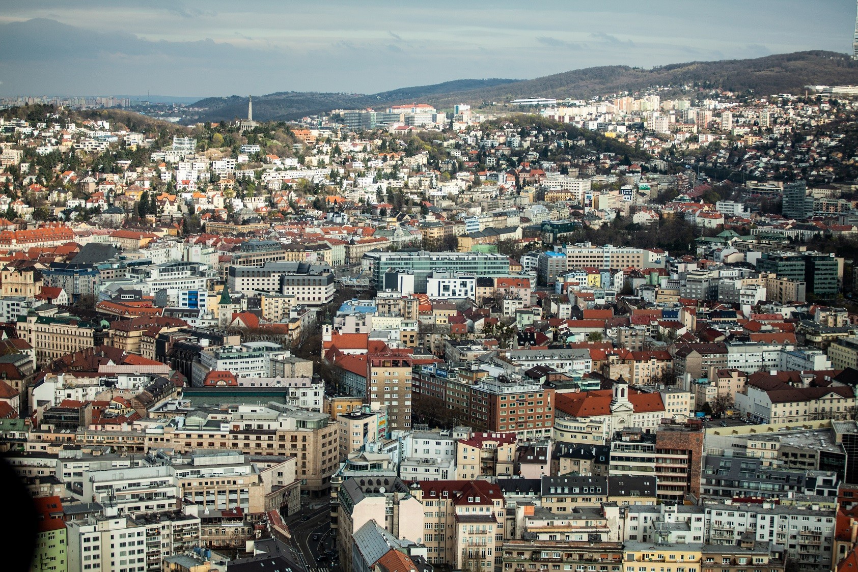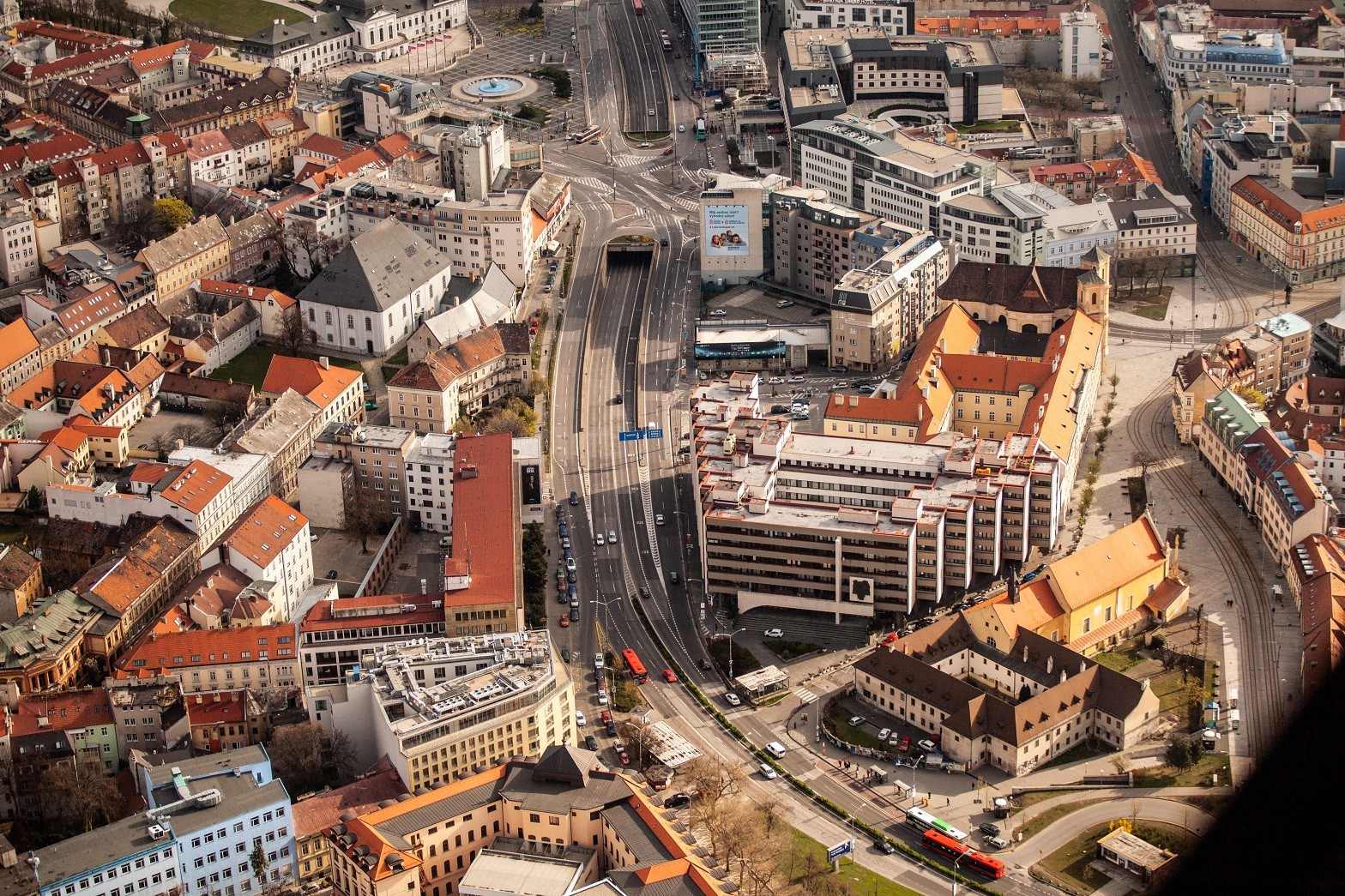 Vpravo je budova Hotela Kyjev, uprostred Klemensova ulica a nad Starým mestom dobre vidno aj Kramáre a nad nimi televíznu vežu.