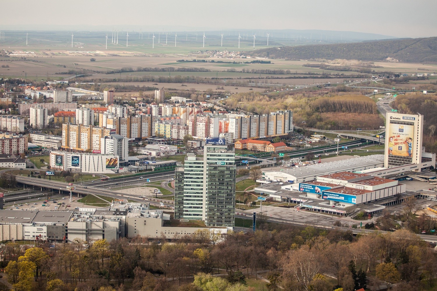 Vľavo nákupné centrum Aupark, vpravo areál výstaviska Incheba a v pozadí aj Gymnázium Alberta Einsteina, ktoré starí Bratislavčania volali Makarenkova.