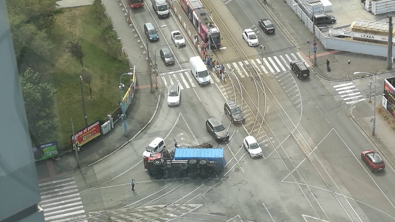FOTO: Na križovatke Vajnorskej a Tomášikovej ulice sa prevrátilo nákladné auto - zablokovalo aj električkovú trať!