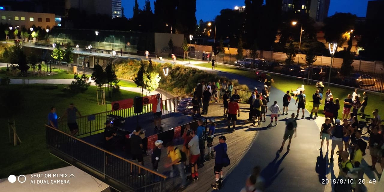 Aj keď park JAMA na rohu ulice Odbojárov a Kalinčiakovej je počas leta oficiálne otvorený od 6,00 hod. ráno do 22,00 hod. večer, tak najviac ľudí doň chodí ráno behať a cvičiť, poobede či podvečer relaxovať. A v piatok tu bolo najrušnejšie netradične až po zotmení, nakoľko sa tu konala akcia Bratislava Inline 2018, ktorej sa zúčastnili milovníci kolieskových korčúl, kolobežiek, bicyklov, ale aj skateboardov.