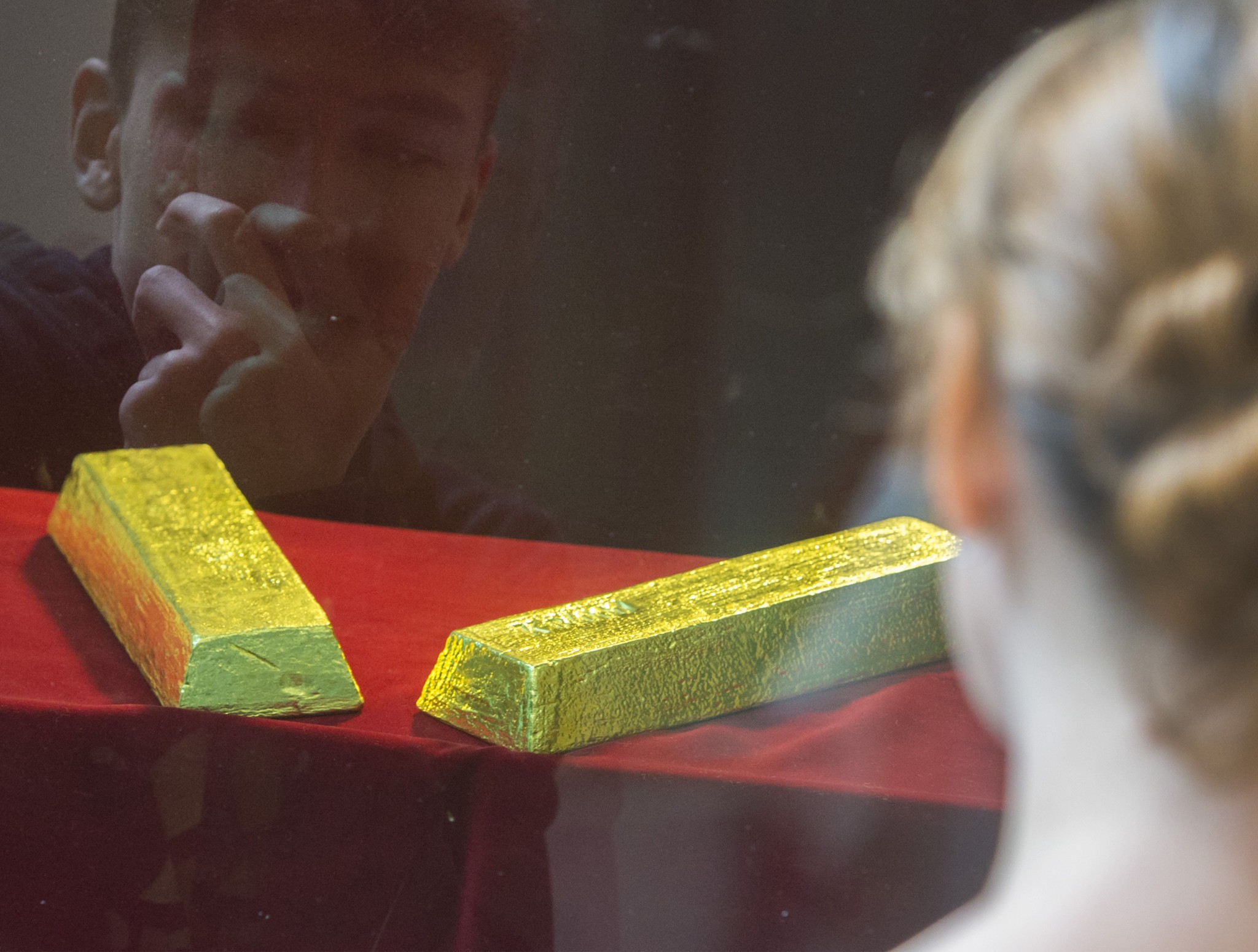 V sklenenej vitrínke boli vystavené aj dve zlaté tehličky. Hmotnosť jednej zlatej tehličky je 12,46 kilogramu a jej hodnota je viac ako 411.884 eur.
