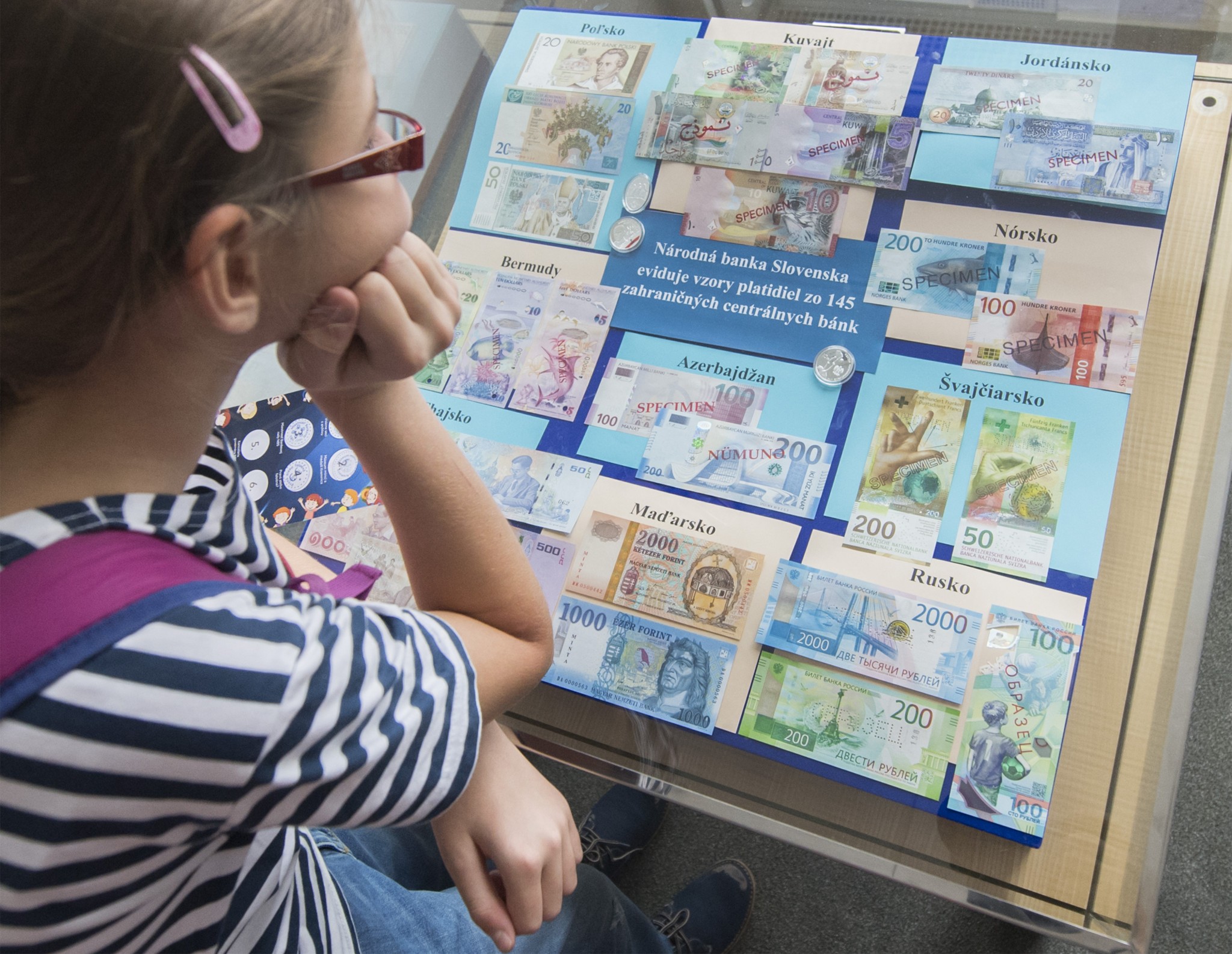 Na snímke si dievča prezerá bankovky z rôznych krajín sveta. NBS eviduje vzory platidiel zo 145 zahraničných centrálnych bánk.