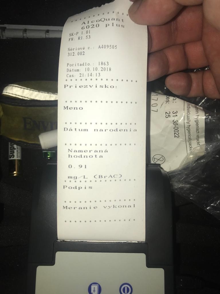"Následne bol vodič podrobený vykonaniu dychovej skúšky na zistenie prítomnosti alkoholu v dychu. Počas nej mu bola nameraná hodnota 0,91mg/l ( 1,90‰ ) alkoholu, opakovaná dychová skúška prítomnosť alkoholu v dychu potvrdila," informovala o kurióznom prípade policajná hovorkyňa Veronika Slamková.