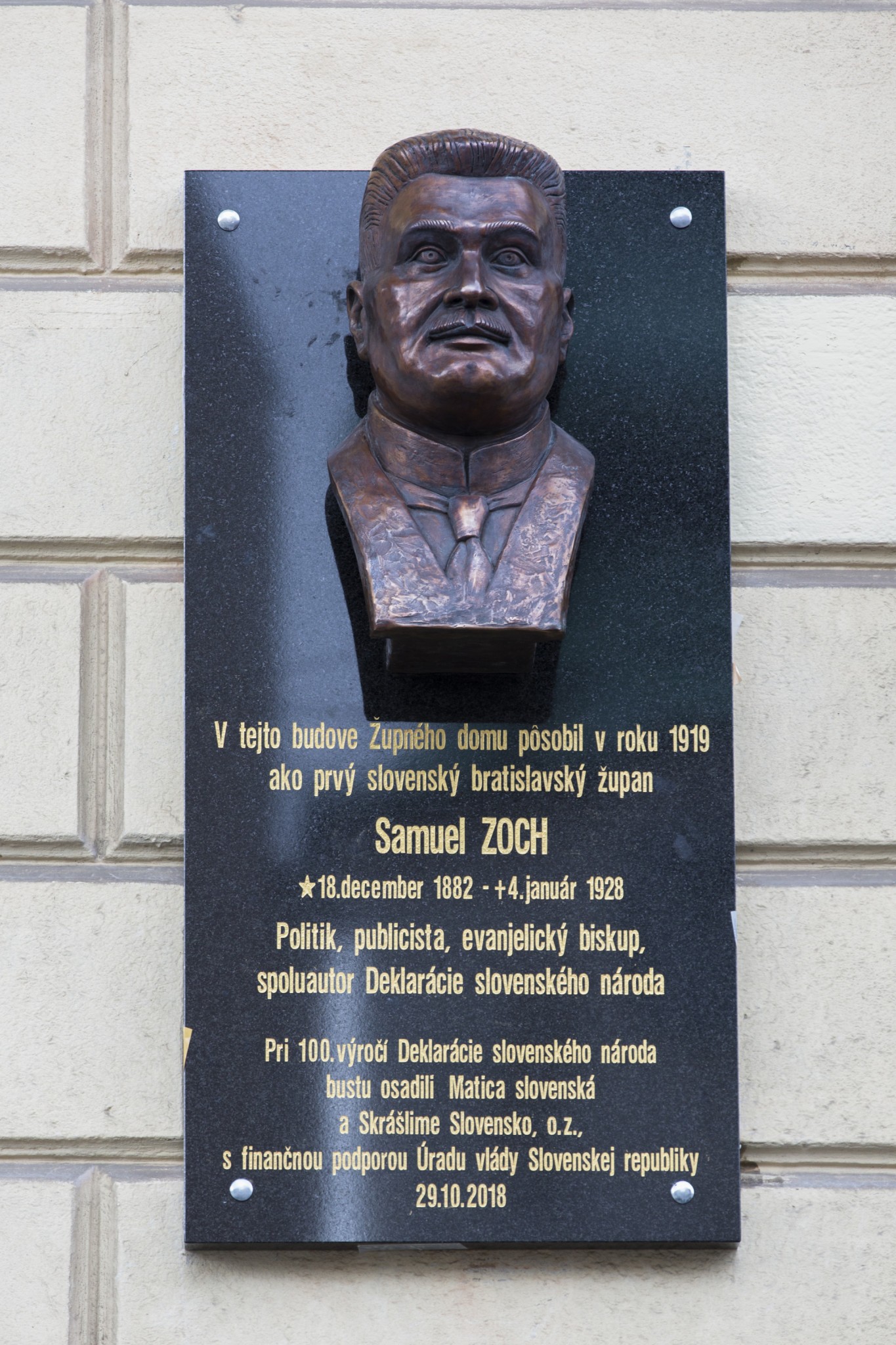 Pred bývalým Župným domom v Bratislave v pondelok odhalili bustu prvému slovenskému bratislavskému županovi v medzivojnovom Československu, spoluautorovi Deklarácie slovenského národa a evanjelickému duchovnému Samuelovi Zochovi. Súčasťou podujatia bol aj odborný seminár o jeho osobnosti.