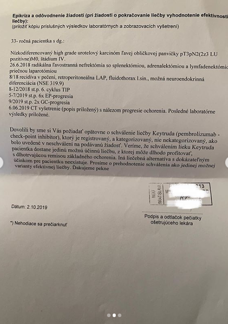 Prof. MUDr. Michal Mego, hlavný odborník MZ SR pre klinickú onkológiu a prednosta Kliniky klinickej onkológie SZU a NOÚ nám potvrdil, že liek Keytruda je riadne zaradený v zozname registrovaných liekov na Slovensku, nie je však kategorizovaný pre prípad tohto typu rakoviny. "Liek Keytruda (pembrolizumab) je kategorizovaný na indikáciu pokročilého melanómu u dospelých (neresakovateľného alebo metastatického melanómu). Tento liek má viaceré použitie pre viac typov nádorových ochorení vrátane pacientov, kde nezaberá chemoterapia. O vhodnosti použitia lieku rozhoduje ošetrujúci onkológ," informoval nás ďalej.