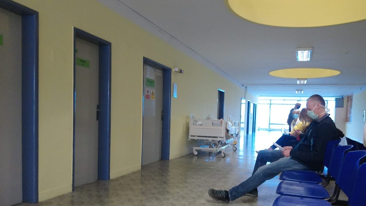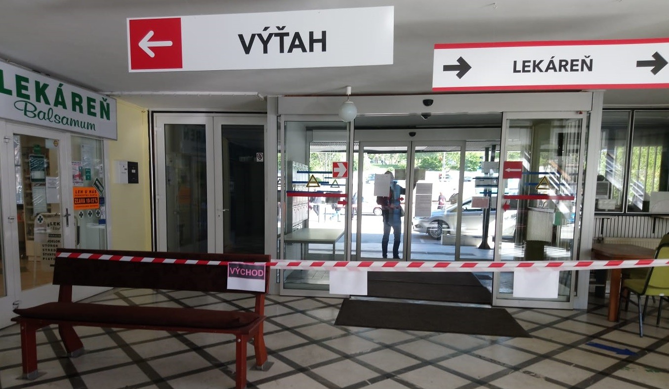 Aj vo vestibule sme opäť narazili na červené pásky s usmerneniami, ktorou uličkou pokračovať ďalej. Bez problémov sme sa dostali do cieľa a čoskoro stojíme v chodbe, kde sa nachádza ambulancia nášho lekára. Čakáren ako aj priestory polikliniky sú poloprázdne.
