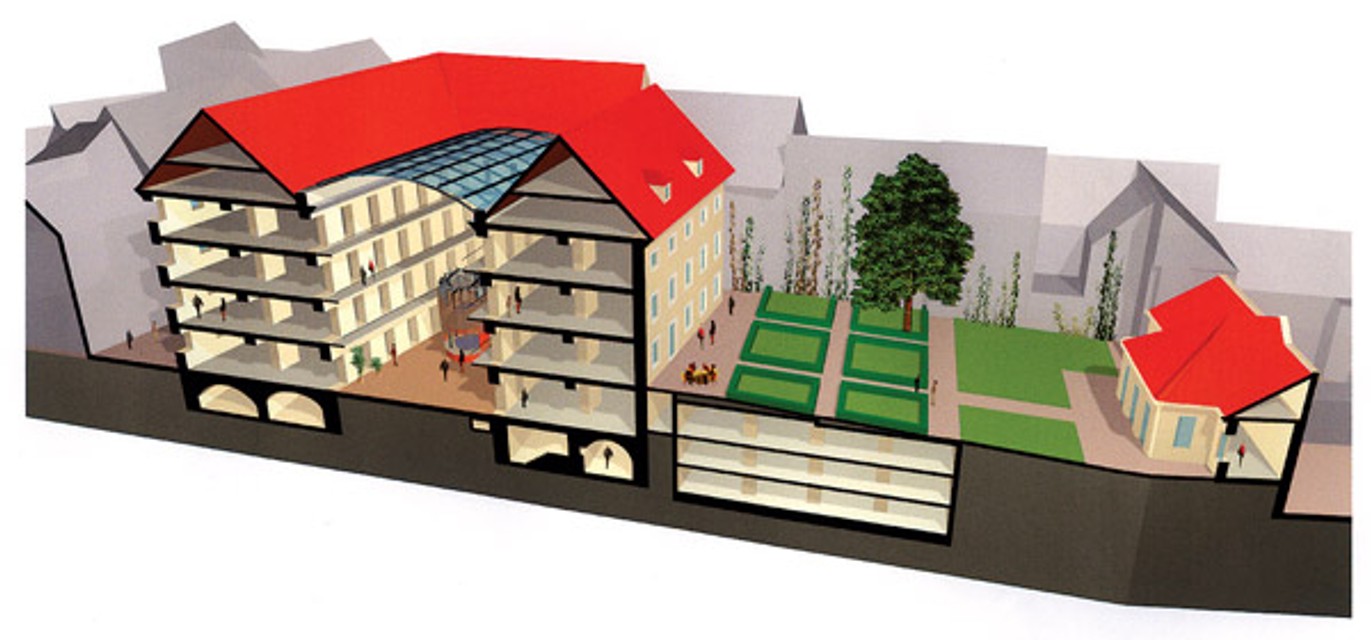 2. Rez knižnicou s Lisztovou záhradou, Lisztovým pavilónom a podzemnými skladmi.