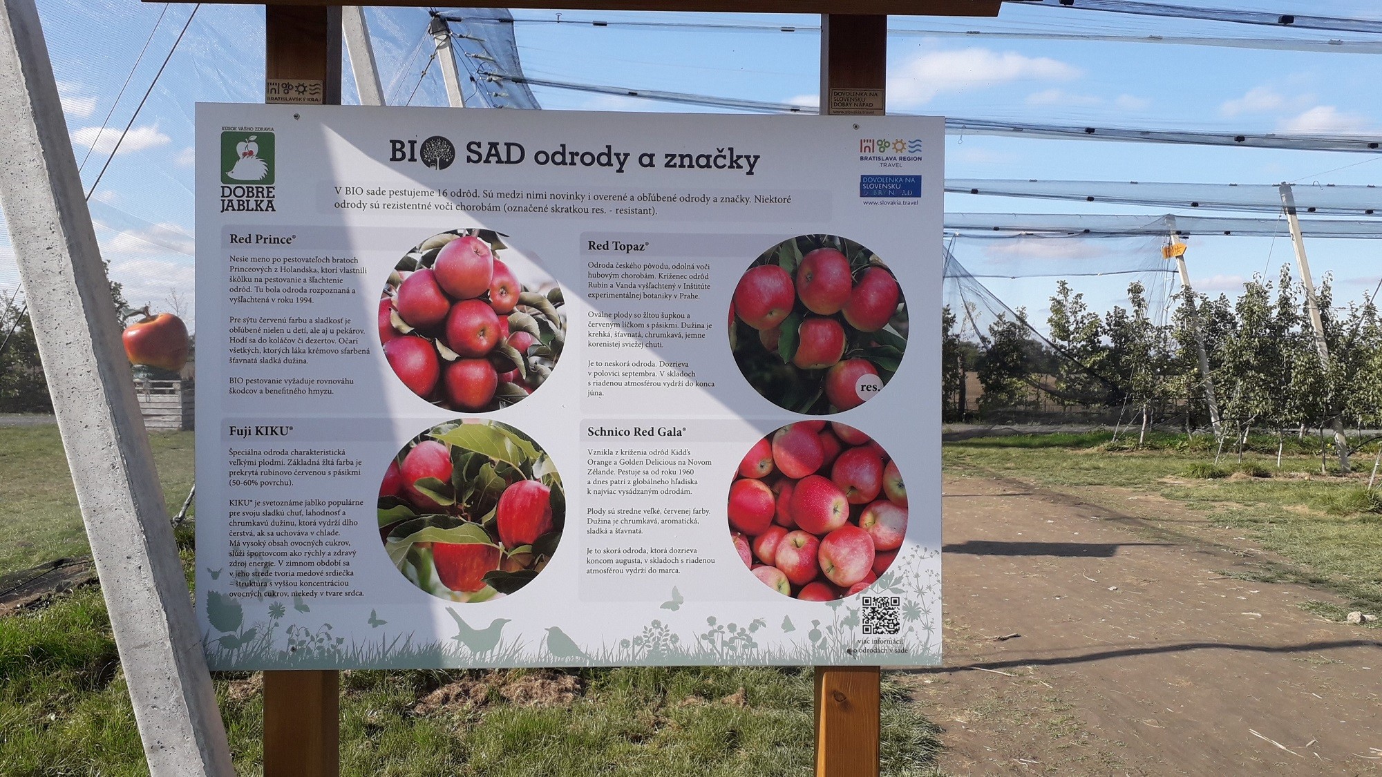 V biosade pestujú až 16 rôznych odrôd jabĺk. Informácie o nich nájdete na tabuliach priamo na mieste.