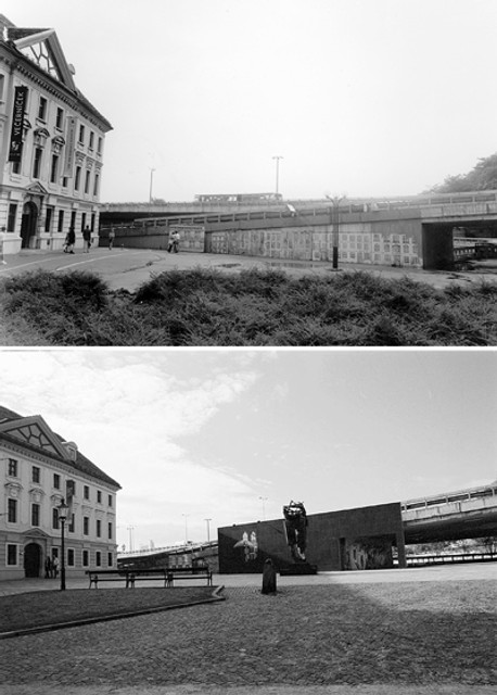 B. OBNOVA A REVITALIZÁCIA PARČÍKA PRED BIBIANOU: Pred rokom bol na konci Panskej ulice pred Bibianou inštalovaný pamätník obetiam holokaustu. Vyrástol na mieste, kde do konca 60. rokov stála neologická synagóga. Súčasťou bronzovej plastiky, ktorá stojí v strede tohto priestoru, je aj Stena spomienok z čierneho lešteného kameňa.