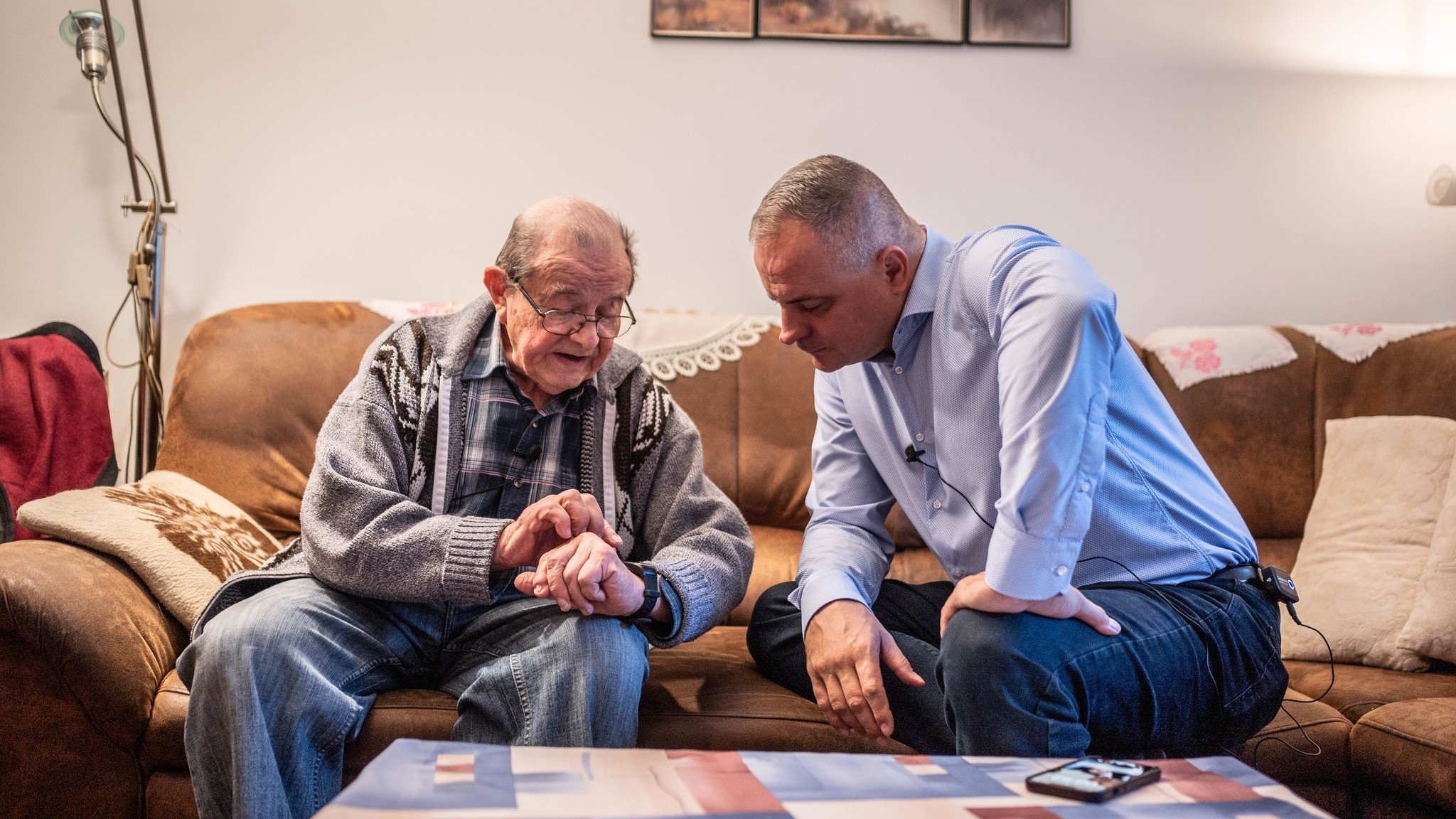 Senior ukazuje monitorovacie hodinky predsedovi BSK Drobovi.