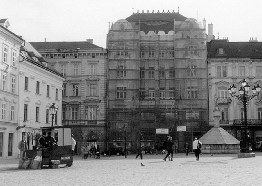Lešenie a stavebný ruch prezrádza, že v budove bývalej Eskomptnej banky sa niečo deje.