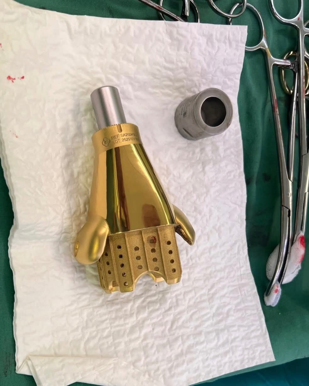 S výsledkom operácie sú podľa jeho slov lekári spokojní. „Protéza splynula s kosťou a celé je to pekne osteointegrované. Resekčné okraje sú čisté, bez nádoru, čo sme potvrdili definitívnou histológiou. Zobrali sme dostatočné množstvo kosti, recidíva nie je prítomná a pacient môže končatinu postupne zaťažovať,“ priblížil odborník.